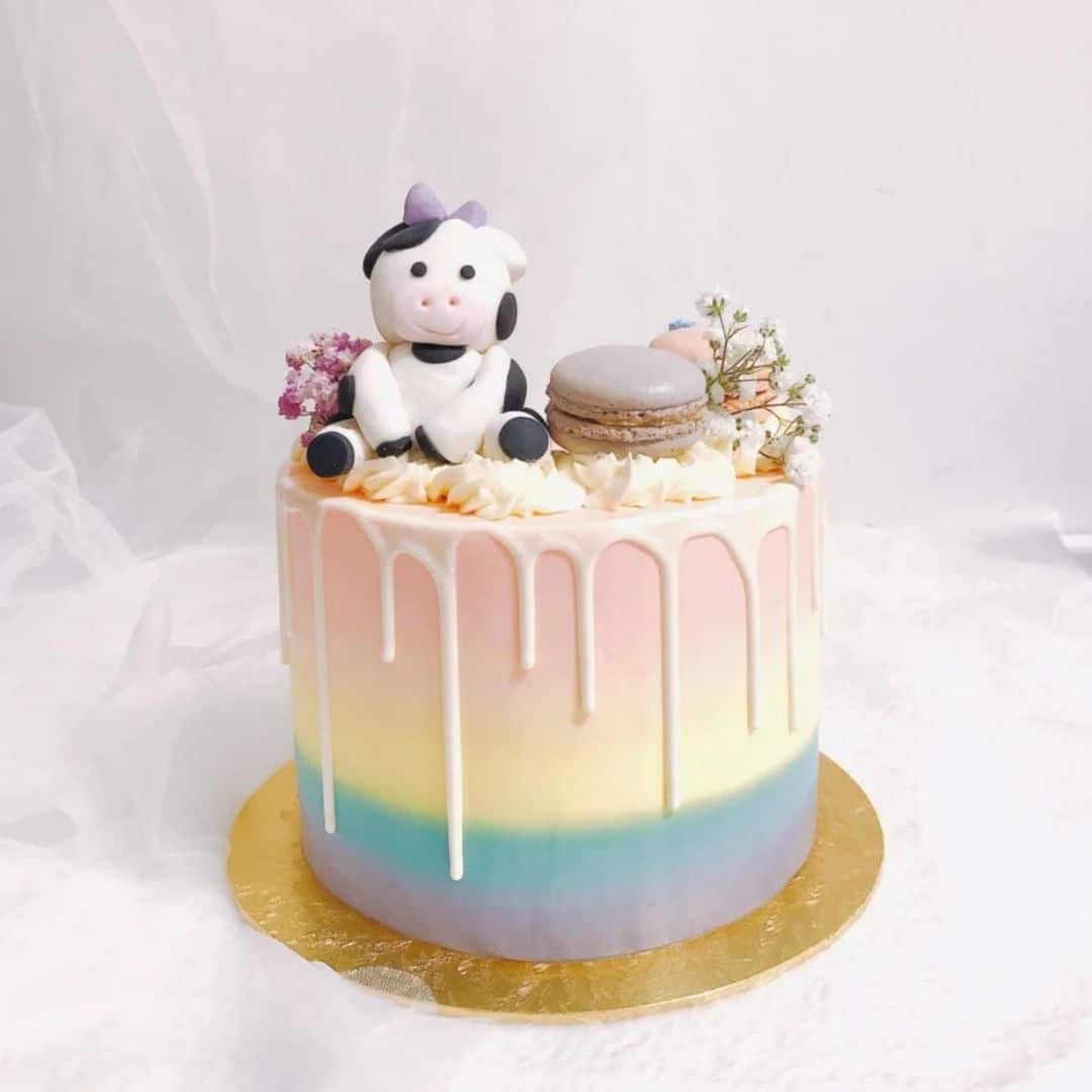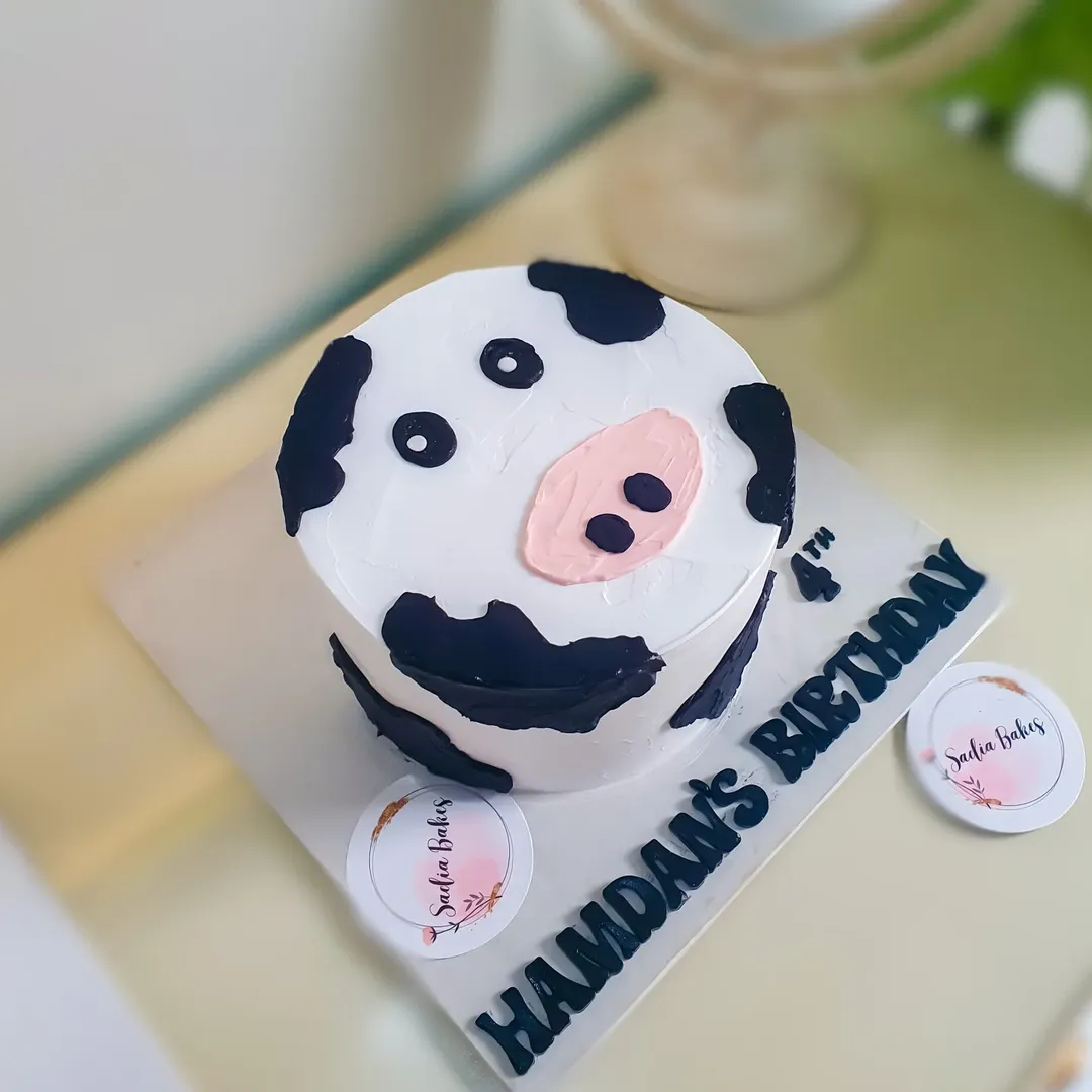 A sweet, pastel-themed cake with a cute baby calf design, perfect for baby showers or first birthdays. The cow can be drawn or shaped in a sleeping pose, with big gentle eyes and soft colors like beige, cream, and light pink instead of stark black and white. Inside, flavors like vanilla sponge with strawberry filling suit the soft, delicate theme. Decorate with edible clouds, tiny fondant flowers, and maybe a miniature milk bottle for added sweetness. This style appeals to those wanting something adorable yet still elegant.
