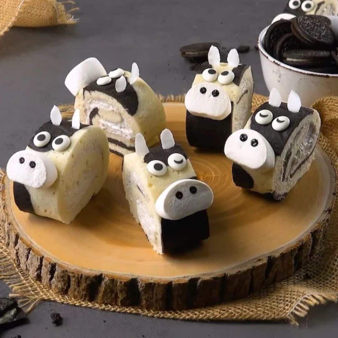 A Swiss roll-style sponge cake with cow print patterns baked directly into the sponge. The outside features white and chocolate sponge spots, while the inside can be filled with whipped cream or flavored buttercream. This is a smaller, more casual cake idea—great for tea parties, picnics, or small celebrations. It’s fun because each slice keeps the cow print pattern, making it visually appealing. You can wrap it with a ribbon and add a small fondant cow face for presentation.