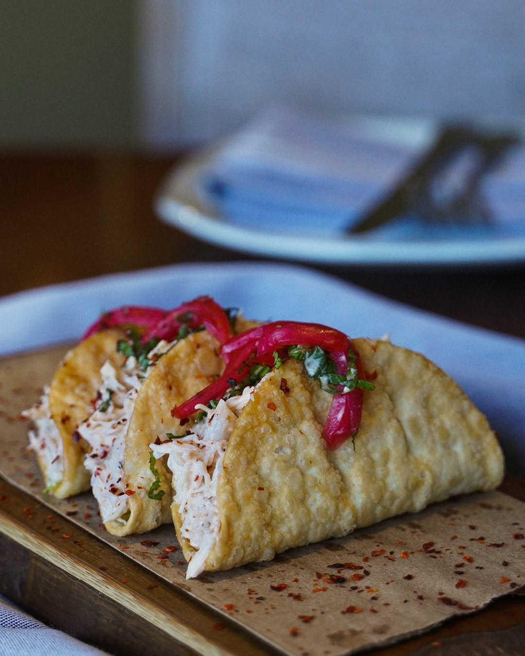 Soft tortillas filled with crab meat, crunchy slaw, and tangy dressing, making a fresh seafood twist on classic tacos.