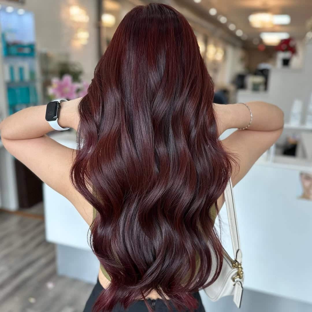 Dark burgundy is a dramatic and elegant hue that blends deep red and purple tones into a dark base. It’s an excellent choice for those who want something bold without going too bright. This color shines beautifully in the sunlight, revealing its hidden red and wine hues. It complements darker skin tones especially well but can also suit lighter complexions with cool undertones. Dark burgundy is a great way to experiment with color while maintaining a sophisticated look. It adds a playful, mysterious vibe and works beautifully on long, layered cuts or romantic waves.
