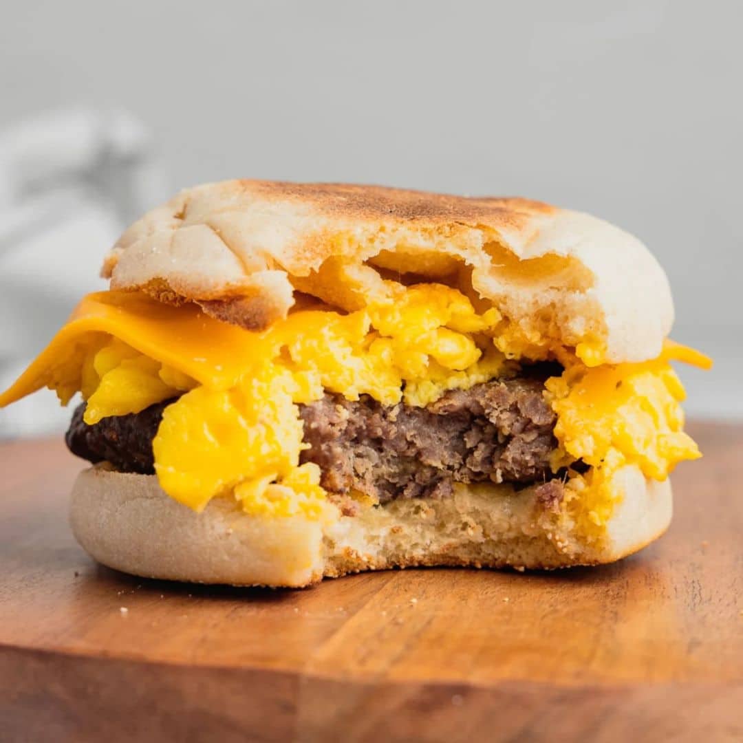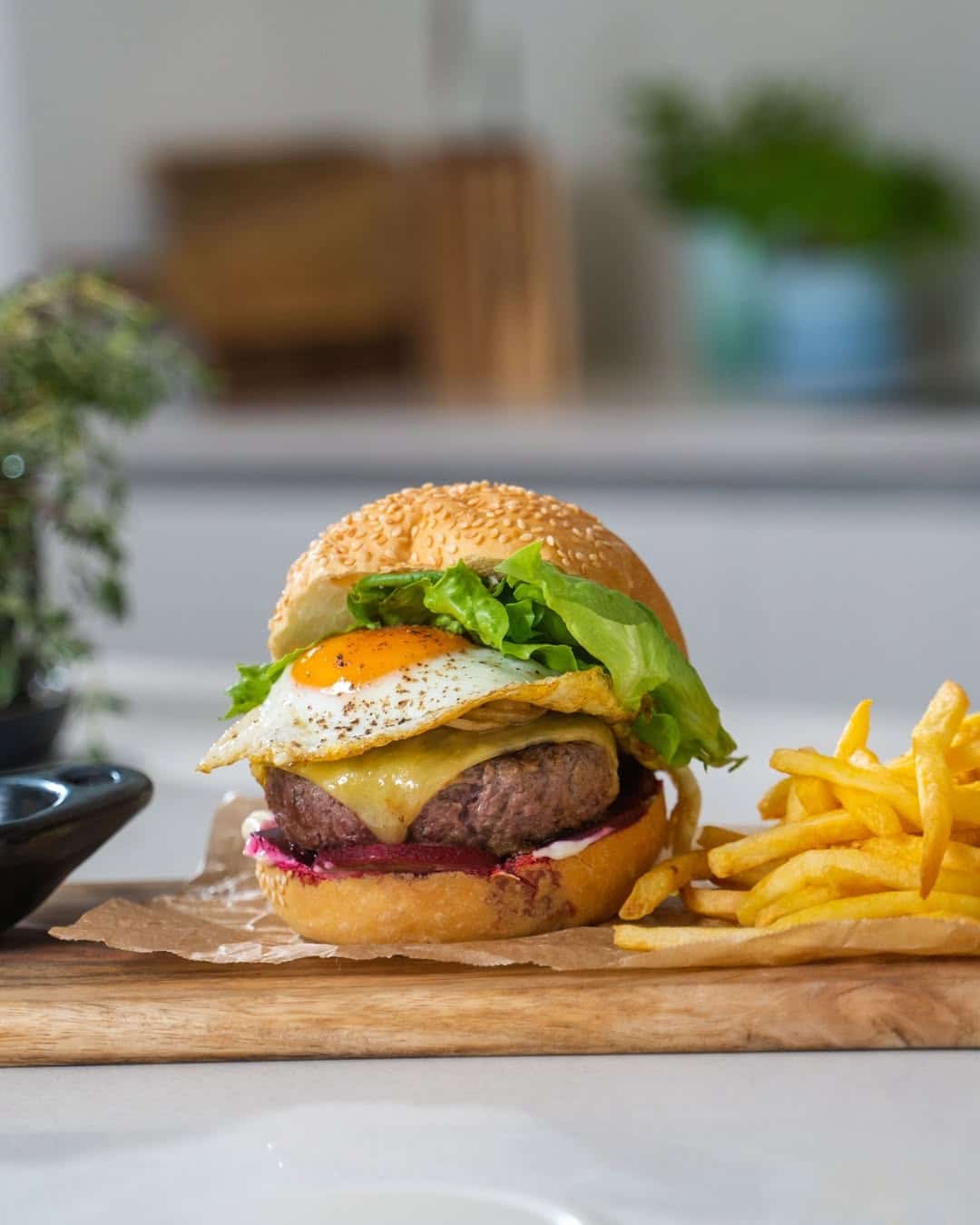 A hearty breakfast-style burger topped with fried egg, bacon, and cheese. Perfect for brunch lovers.