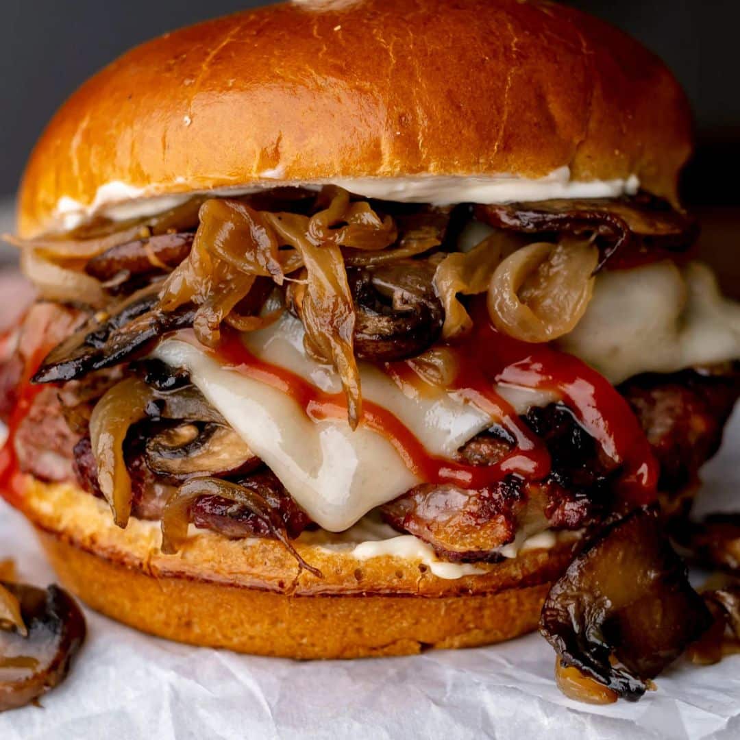 Assemble Burger: Toast buns lightly, place patty with melted cheese on bottom bun, top generously with sautéed mushrooms and onions, then finish with top bun. Serve hot.