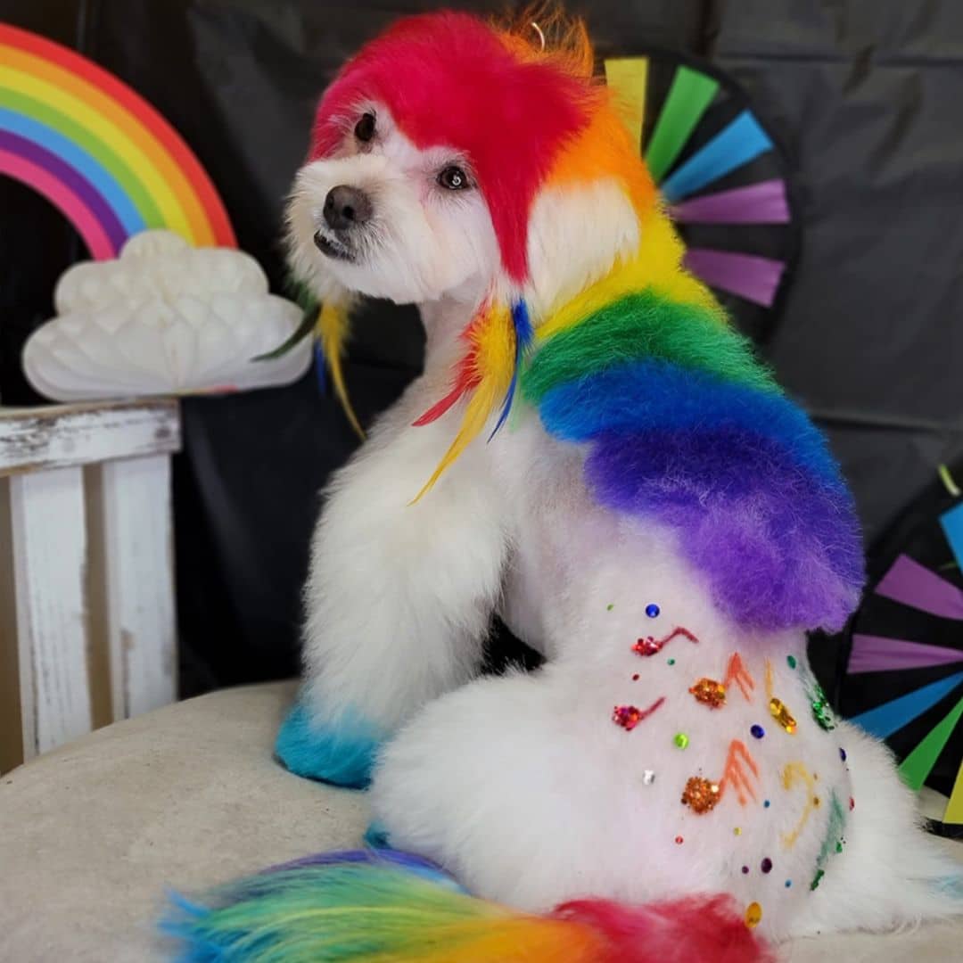 Turn your dog into a magical creature with a rainbow-colored mane along the back or just on the ears and tail. This works well with long-haired breeds and can be achieved using pet-safe dyes in red, orange, yellow, green, blue, and purple. The vibrant colors stand out beautifully in photos and add a cheerful personality to your pup’s look. It’s perfect for parades, pride events, or themed parties. Keep the rest of the fur natural so the rainbow pops. Remember to use gentle dyes and rinse thoroughly for your pet’s comfort and safety.