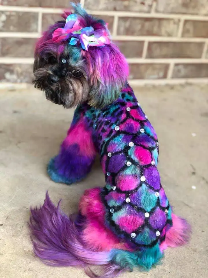An ocean-inspired design uses shades of aqua, teal, purple, and sea green to create a mermaid-like effect on your dog’s fur. Add scale patterns with stencils for a more creative look, or simply dye the ears and tail in shimmering ocean colors. This works beautifully for dogs with wavy or curly fur, giving them a magical underwater aesthetic. It’s a popular choice for summer festivals or beach photoshoots. The mermaid theme is whimsical and dreamy, making your pup look like they’ve just swum out of a fairytale.