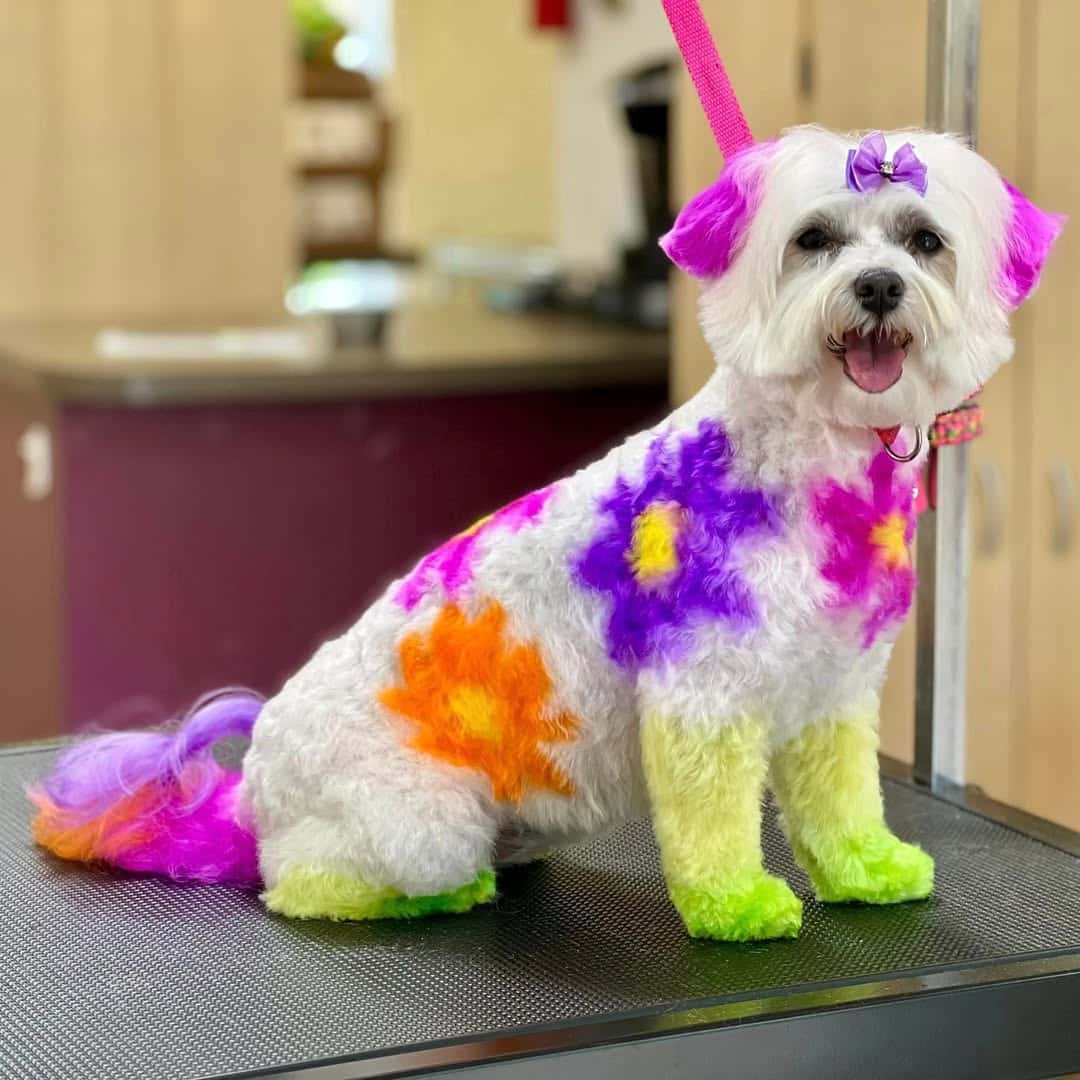 Instead of a solid color, try dyeing small floral designs onto your dog’s fur. Using stencils, you can create roses, daisies, or cherry blossom shapes in pastel shades like pink, lilac, and yellow. This works best on white or light-colored dogs so the flowers stand out. The result is soft, cute, and perfect for spring or garden parties. Floral fur designs look elegant in photos and give your dog a gentle, fairy-tale aesthetic. This style takes a little more time, but the results are worth it for special occasions.