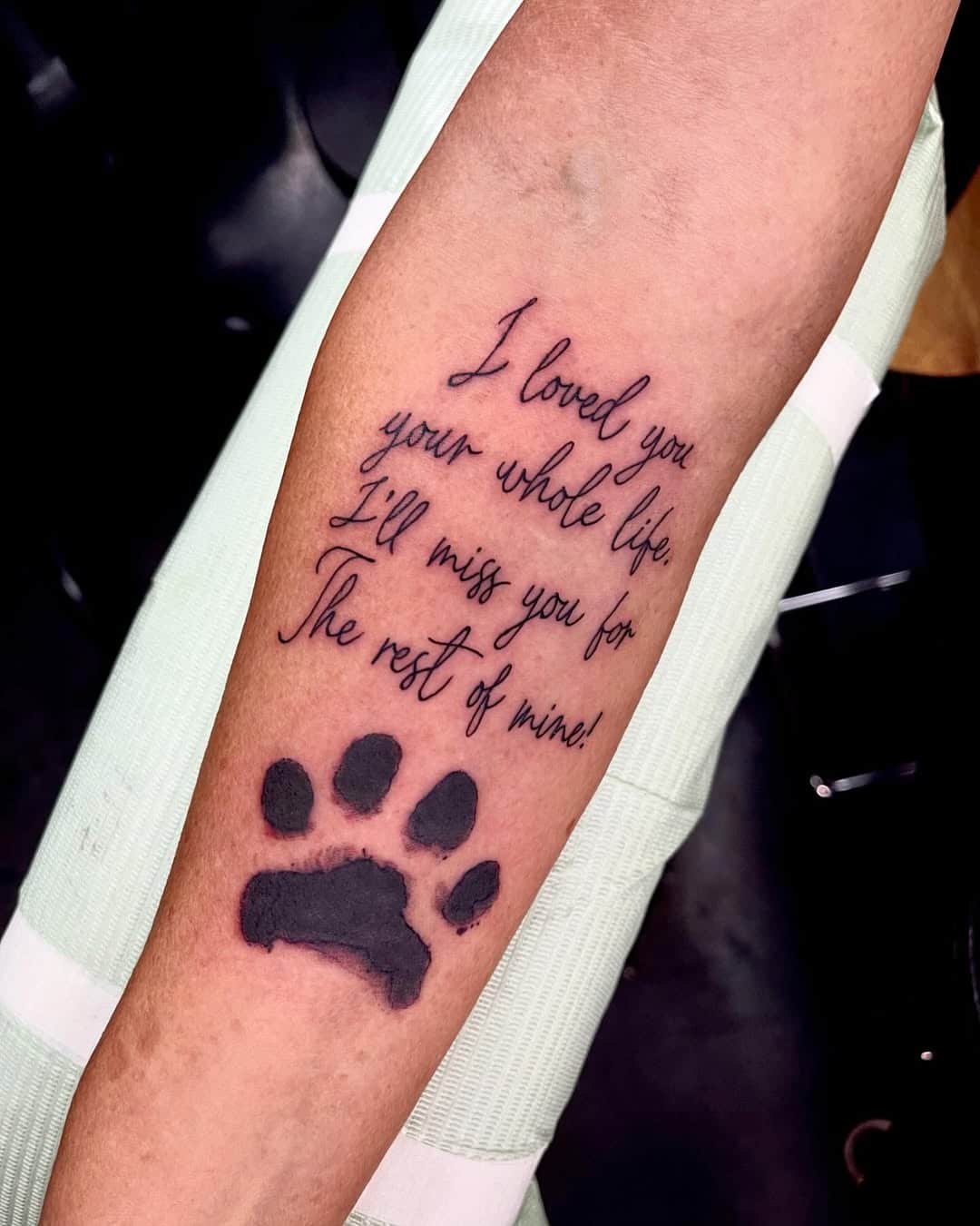 Adding a meaningful quote alongside a paw tattoo creates a deeper narrative. Popular quotes include phrases like “Always by my side” or “Forever in my heart.” The words can wrap around the paw, follow a trail, or form part of the design itself. This tattoo is ideal for those who want to express both emotion and meaning through words and imagery. It works best on larger areas like the ribs, back, or forearm, where text and art can coexist clearly. This design serves as both a visual and written tribute to the bond with your dog.