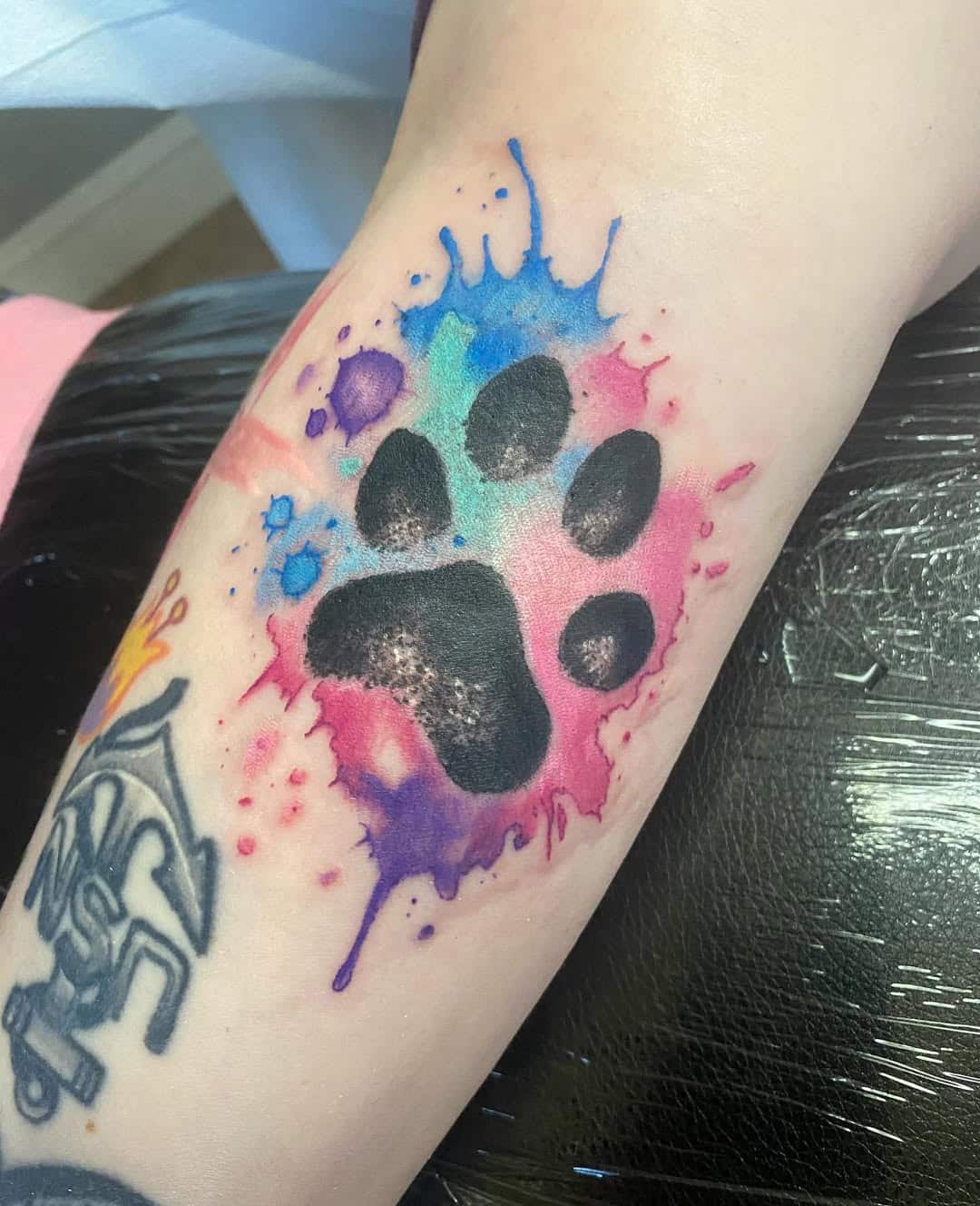 A watercolor dog paw tattoo adds vibrancy and emotion to the design. The paw is inked in black while colorful shades like blue, purple, or red splash around it, mimicking watercolor strokes. This style symbolizes joy, playfulness, and the colorful impact your dog has on your life. Each shade can represent different emotions—blue for calm, red for love, yellow for happiness. The watercolor effect ensures no two tattoos look the same, making it a unique personal tribute. It’s often done on the forearm, shoulder, or calf where the blend of colors can be displayed beautifully.