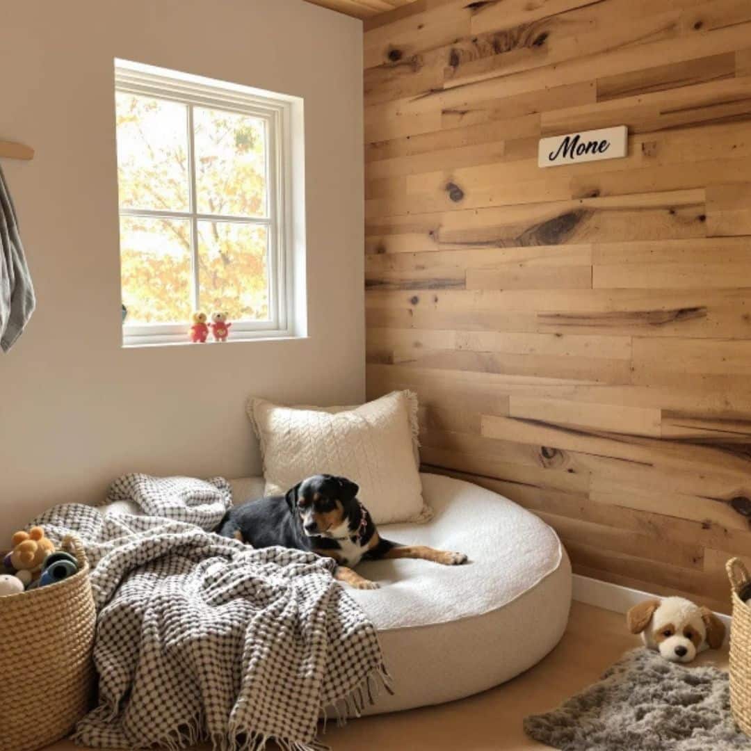 Bring the outdoors inside by decorating with faux grass rugs, dog-safe plants, and nature-themed wallpaper. Add a sunlamp or window access to natural light to mimic the outdoors. A sturdy scratching post, chew toys, or climbing features can keep them engaged. Wooden accents and earth tones make the room feel calming and natural. This theme is perfect for dogs that love the outdoors but can’t always be outside due to weather or city living. It creates a refreshing environment where they feel connected to nature even indoors.
