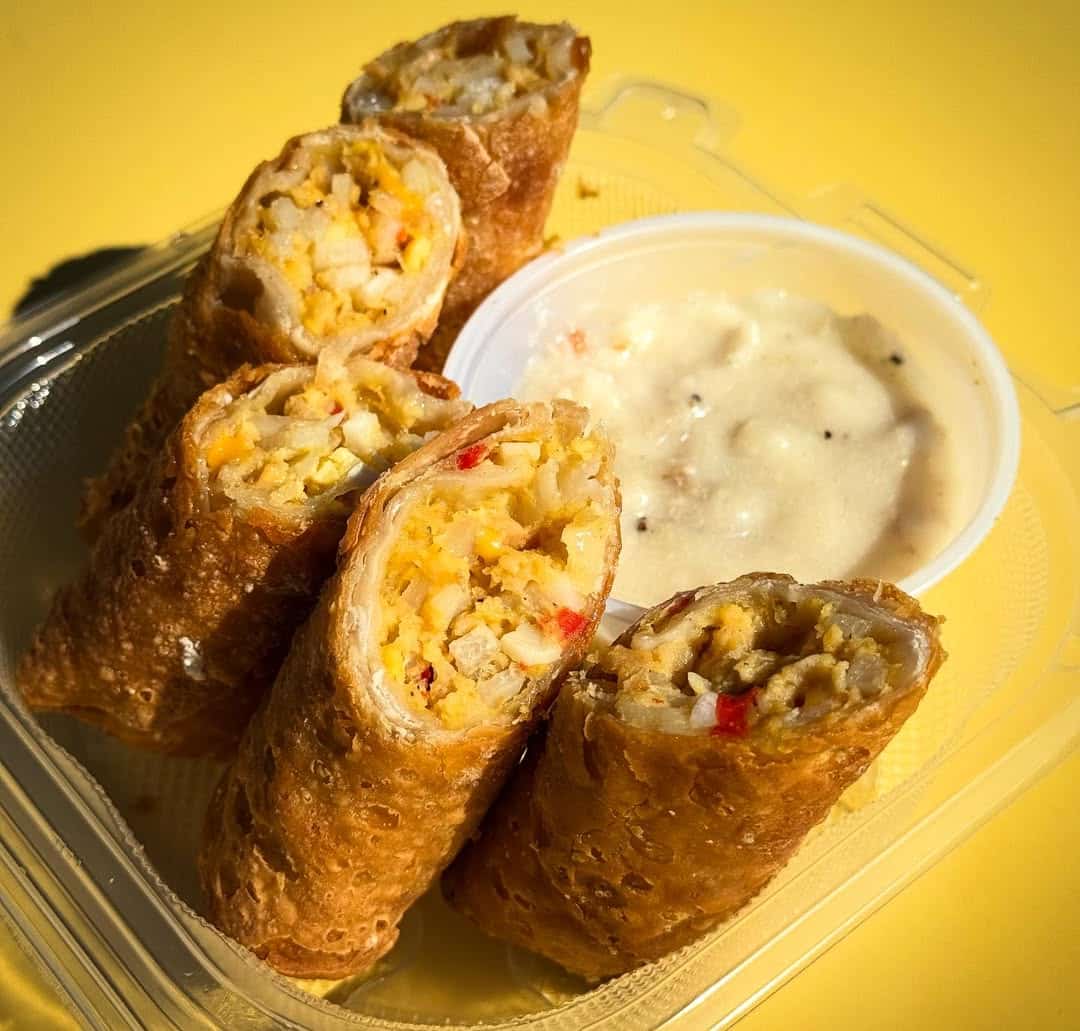 Eggs, bacon, and cheese inside crispy wrappers for a fun breakfast twist.