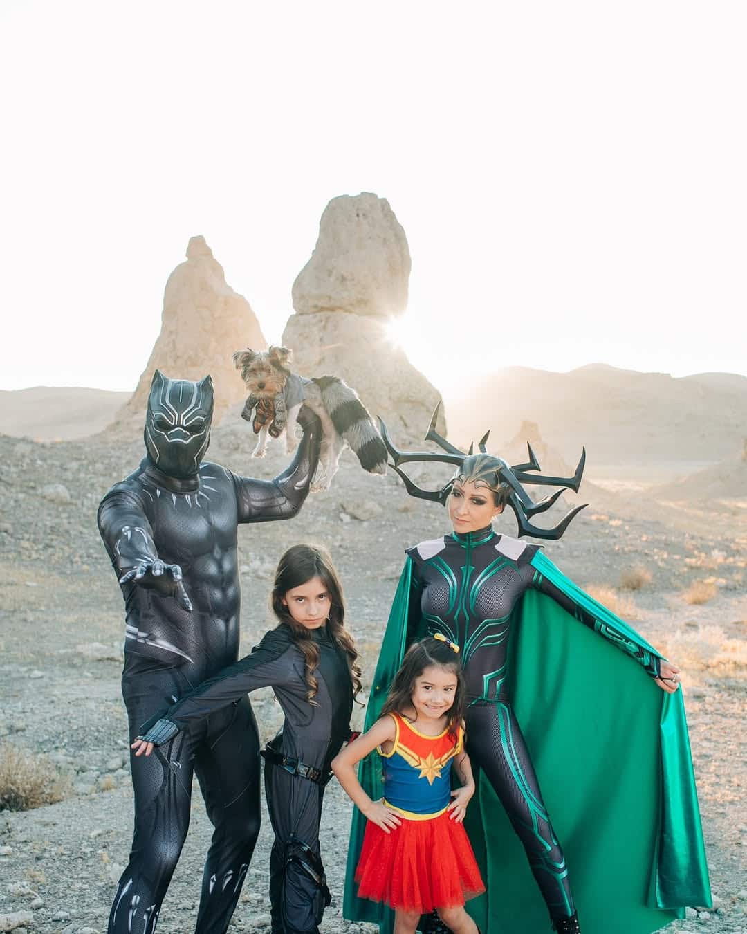 Families can transform into their favorite superheroes like Batman, Wonder Woman, Superman, Spider-Man, Captain America, or Black Panther. This theme gives kids the thrill of being their heroes while parents enjoy nostalgia. You can mix universes or stick to one team like the Avengers or Justice League. Costumes are easy to find or DIY with capes, masks, and body suits. Props such as shields, hammers, or lassos complete the ensemble. This idea is exciting for families who love action and energy. Plus, you can pose for epic group photos that look like you’re ready to save the world together.