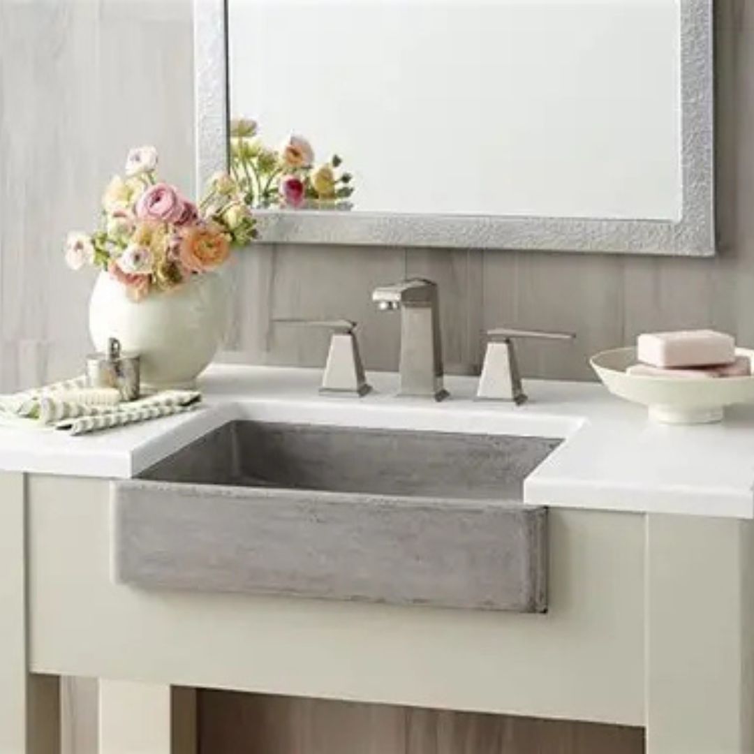 An apron-front sink delivers classic farmhouse appeal while being practical and stylish. It becomes a focal point in the bathroom.