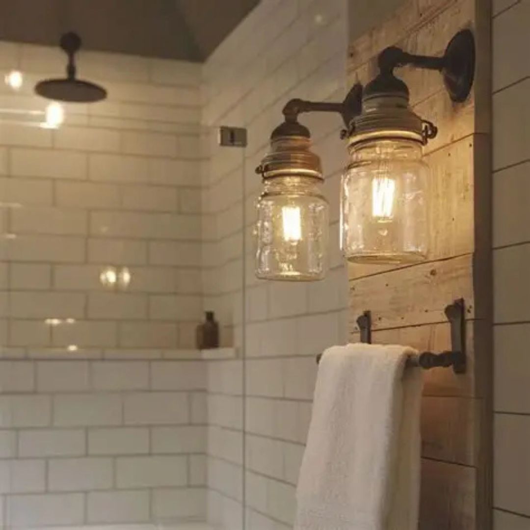 Install mason jar pendant lights above the vanity or tub area.