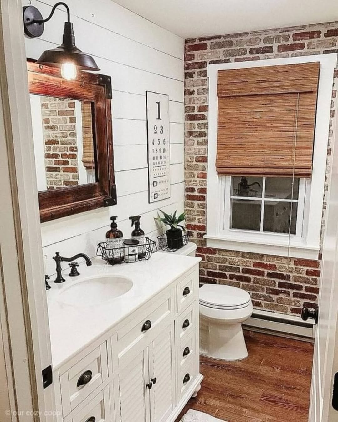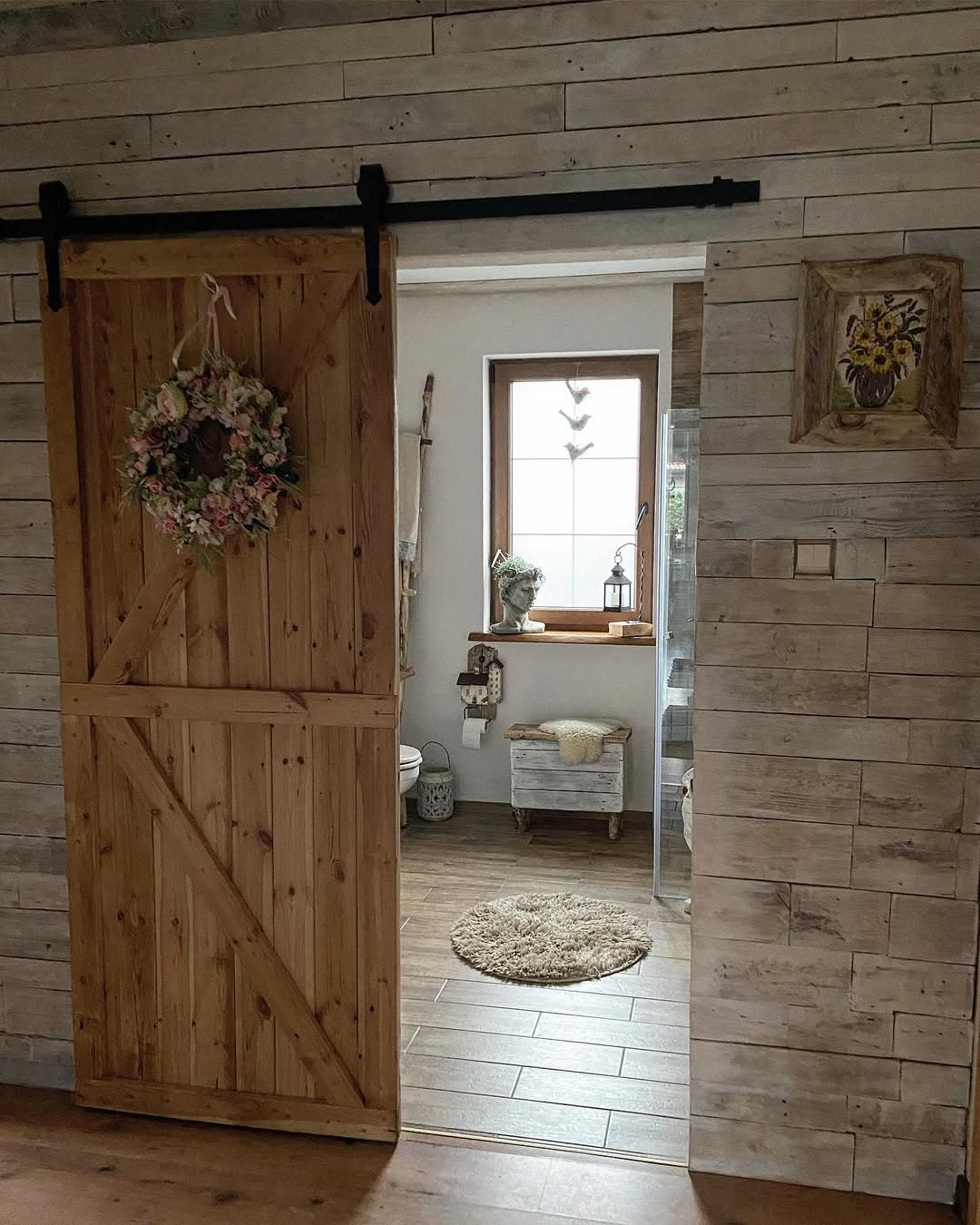 A sliding barn door instantly transforms the bathroom into a farmhouse-inspired space. It adds character while saving space.