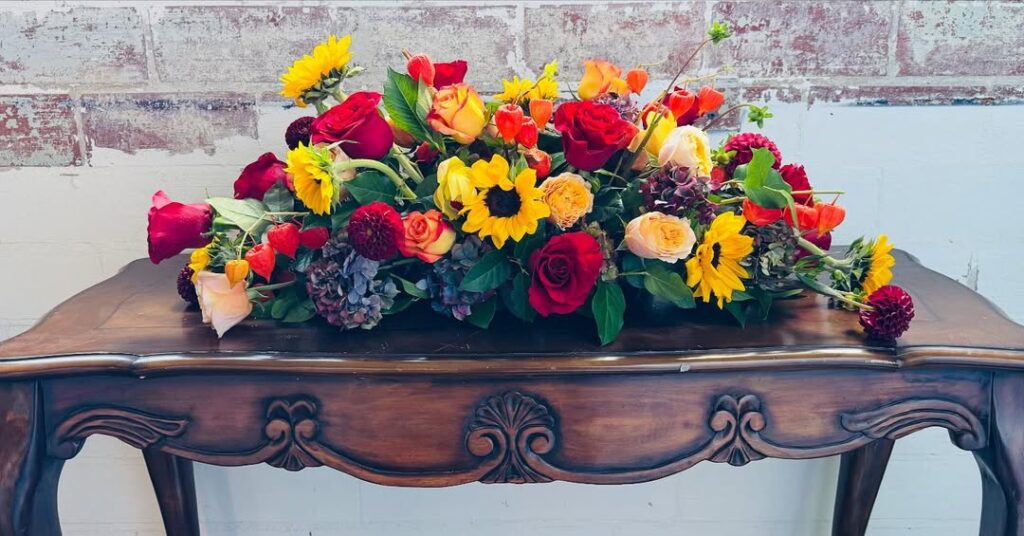 Autumn arrangements feature oranges, reds, and yellows. Use chrysanthemums, marigolds, and dried leaves. Pumpkins or pinecones add charm. This style celebrates fall warmth. Perfect for dining tables. Texture variety creates depth. A wooden or ceramic container works best.