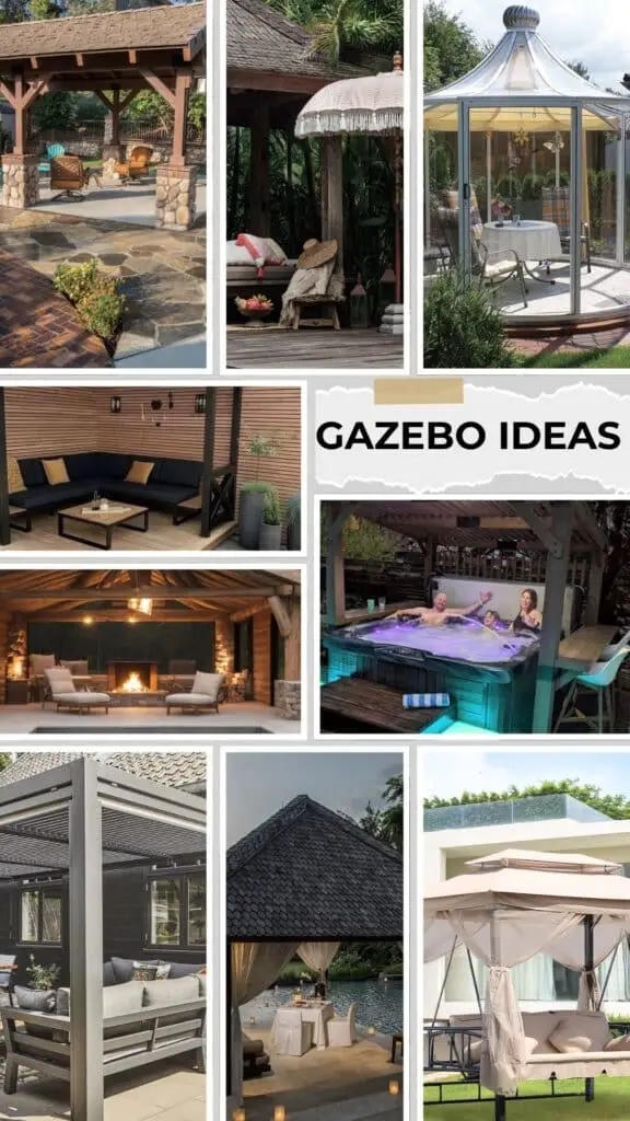 Gazebo Ideas – A gazebo can serve as both a charming focal point in your garden and a functional space for relaxation or entertaining guests. When planning your gazebo design, consider its purpose first — whether it will be a cozy reading nook, an outdoor dining spot, or a social gathering space. For a romantic and classic look, you might choose a wooden gazebo with lattice sides and climbing vines such as wisteria or roses. For a modern twist, opt for a sleek metal frame with minimal lines, paired with glass or polycarbonate roofing for weather protection. Lighting plays an important role, too — string fairy lights along the beams for evening ambiance, or install lantern-style fixtures for a warm, welcoming glow. You can also enhance comfort with weather-resistant furniture, colorful cushions, and an outdoor rug to define the seating area. For added charm, incorporate elements like hanging planters, curtains for privacy, or even a small fire pit at the center to make your gazebo usable year-round.