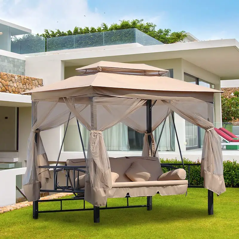 Instead of static chairs, this gazebo incorporates hanging swings or suspended benches. Swing seating adds a playful and relaxing element, making it perfect for both adults and children. Use weather-resistant ropes or chains, and choose padded cushions for comfort. A wooden or metal structure works well, with an open-sided design for fresh air. Adding string lights or lanterns creates a cozy nighttime vibe. This style is ideal for reading, napping, or enjoying gentle motion while chatting with friends. It brings a whimsical charm to any backyard.