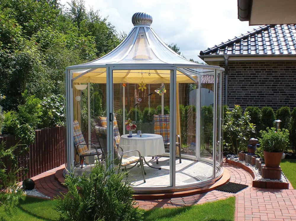 Combining gardening with leisure, a greenhouse gazebo is made of glass panels or transparent polycarbonate. It lets in natural sunlight, making it ideal for growing plants while still serving as a sitting area. Add potted herbs, flowers, or even small vegetables for a lush environment. A central seating space surrounded by greenery creates a peaceful, aromatic retreat. Ventilation panels help regulate temperature, and fairy lights can make it inviting at night. This hybrid design is perfect for nature enthusiasts who want a year-round garden retreat, even during cooler seasons.