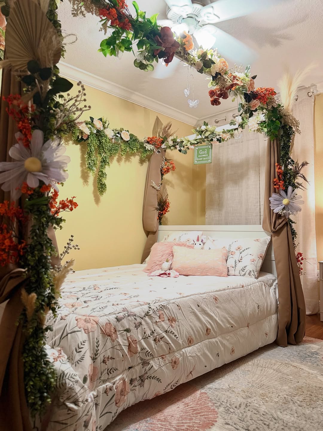 This idea transforms the bedroom into a magical fairy garden where imagination thrives. Use wall murals of flowers, butterflies, and forest scenes to create an immersive environment. Add canopy beds with hanging faux vines, twinkling string lights, and soft green rugs mimicking grass. Decorative mushrooms, small lanterns, and floral bedding enhance the fantasy theme. Incorporate natural wood furniture for a woodland touch. A craft corner with pastel art supplies helps bring creativity alive. This bedroom idea is perfect for nature-loving girls or anyone who dreams of living in an enchanted forest full of magic, calm, and wonder.