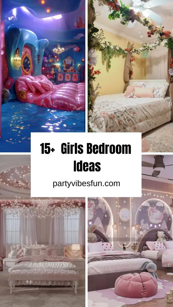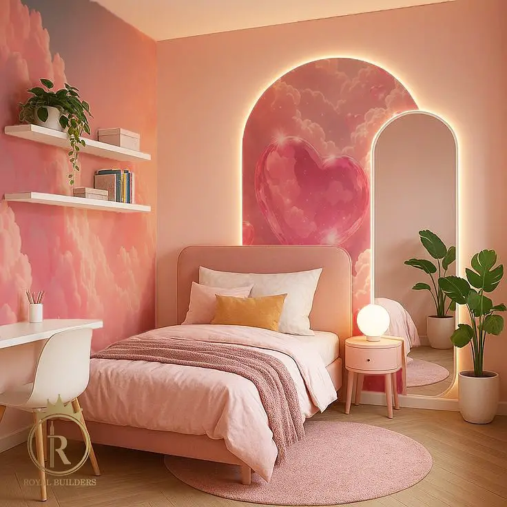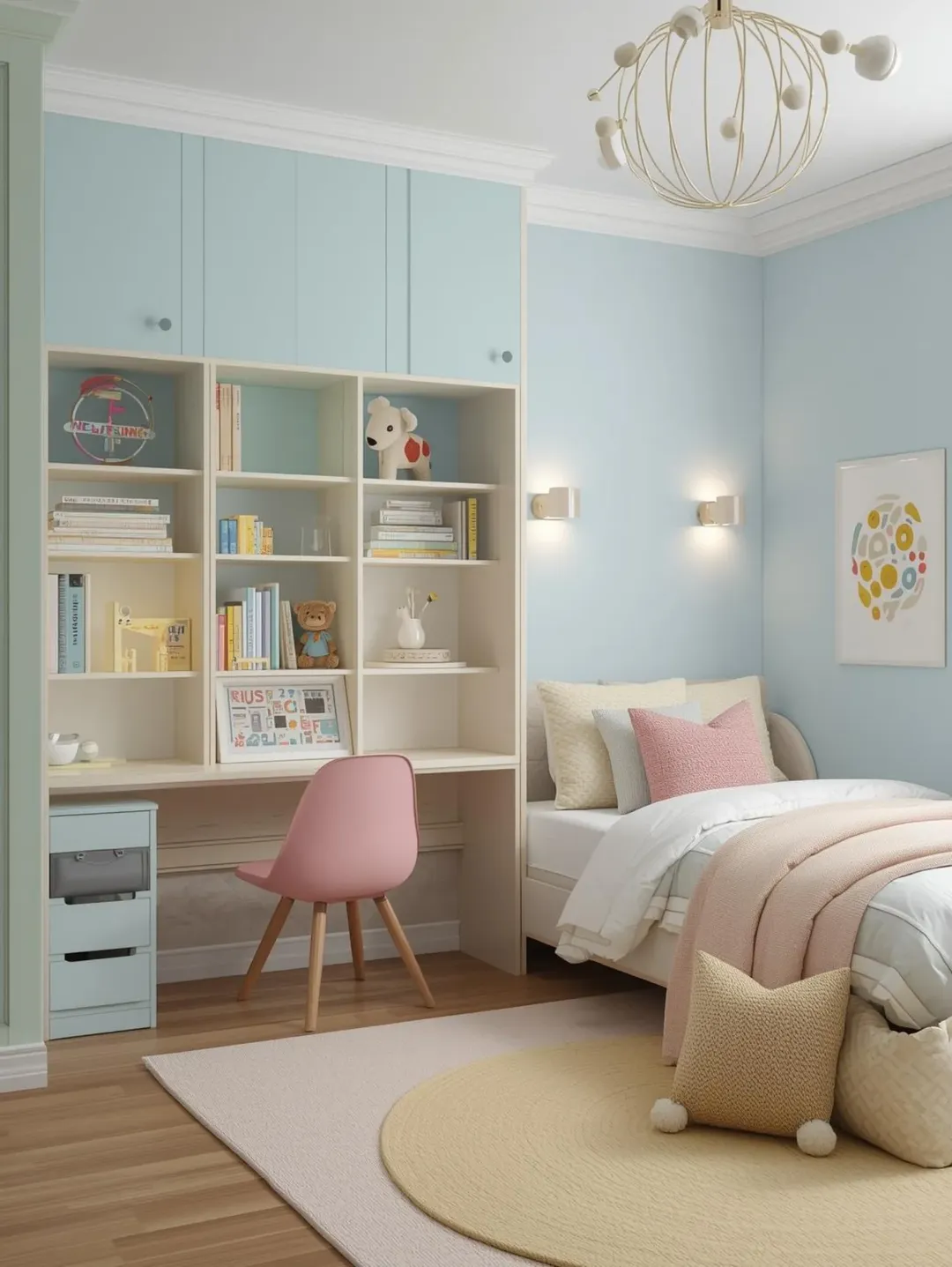 A pastel dreamscape bedroom blends soft pinks, lavenders, mint greens, and baby blues for a calming, whimsical atmosphere. Light-colored furniture, fluffy rugs, and sheer curtains enhance the airy feel. Add cloud-shaped wall shelves, pastel ombré bedding, and warm fairy lights to create gentle ambiance. A cozy reading nook with cushions and plush toys invites relaxation. Incorporate subtle metallic accents—rose-gold lamps or mirror frames—to elevate the elegance. This theme works beautifully for girls who love soft colors, peaceful spaces, and a dreamy, magical vibe without overwhelming boldness. It’s both stylish and comforting, perfect for rest and creativity.