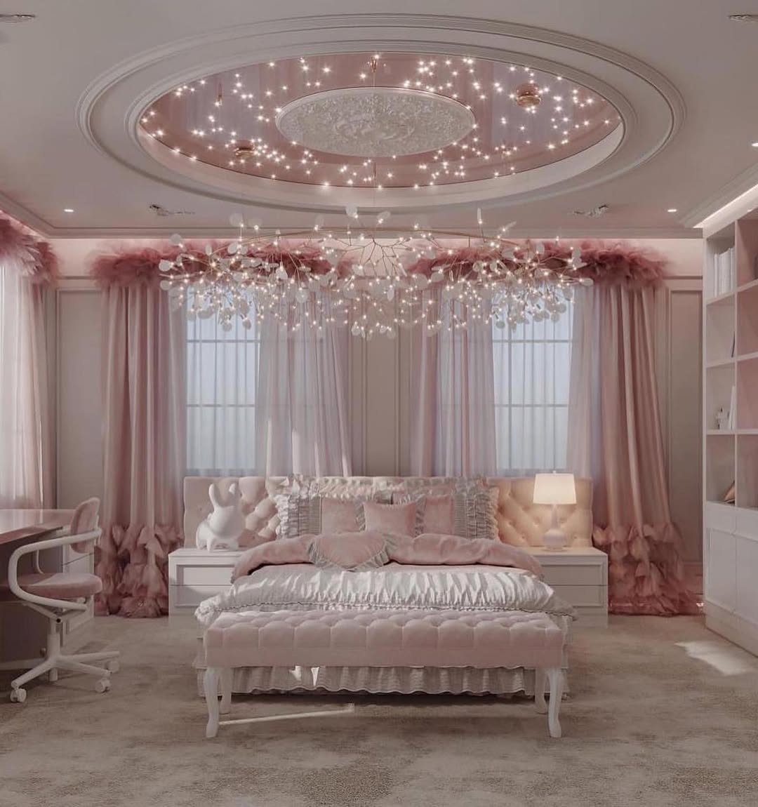 This bedroom idea captures elegance and royalty with luxurious fabrics, gold accents, and ornate décor. A tufted headboard or canopy bed instantly adds glamour. Soft velvet bedding, plush rugs, and crystal-style chandeliers elevate the room. Incorporate mirrored furniture, gold-framed artwork, and soft blush or lavender tones for sophistication. Add a small vanity with Hollywood lighting for a princess-like experience. Subtle glitter décor or sequin pillows add magic without overwhelming the space. Perfect for girls who love a glamorous, regal vibe with plenty of sparkle and elegance.