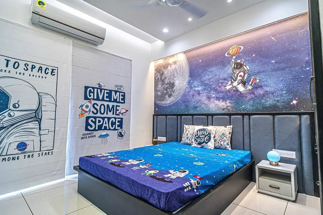 Transform the room into a galactic escape with dark navy walls, glowing star stickers, and galaxy-themed bedding. Add LED projectors that cast constellations across the ceiling. Decorate with planets, rockets, and astronaut accents. A study corner with a space-themed desk encourages curiosity and learning. Metallic silver accessories—lamps, frames, or shelves—enhance the futuristic aesthetic. Glow-in-the-dark elements make nighttime enchanting. This room suits adventurous girls fascinated by science, astronomy, and exploration, creating an inspiring space that feels out of this world.