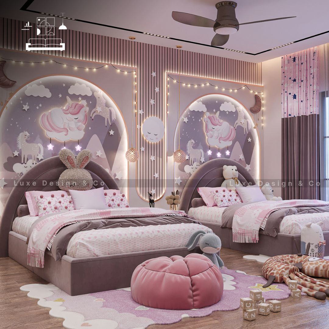 A unicorn-themed room brings magic to everyday life with pastel rainbows, shimmering fabrics, and charming accents. Feature a unicorn mural or removable wall decals as the centerpiece. Opt for iridescent cushions, fluffy rugs, and glittery curtains to add sparkle. A canopy bed with soft tulle draping enhances the fairy-tale look. Add decorative items like star-shaped lamps, rainbow shelves, and plush unicorn toys. Soft lighting, especially fairy string lights, creates a dreamy ambience. This theme suits girls who love fantasy, whimsy, and playful colors, turning their bedroom into a magical retreat.