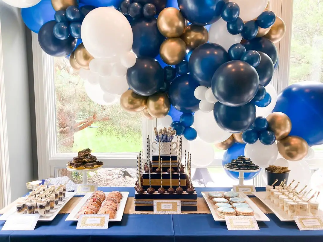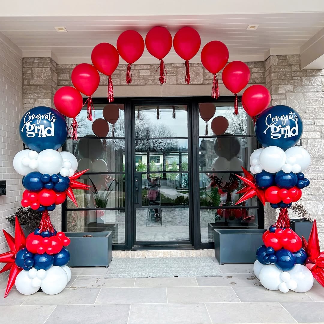 Create a grand entrance with a custom balloon arch in your school colors. Mix metallics, solids, and confetti-filled balloons for a festive look. Add a banner with the graduate’s name or graduation year at the center. Small LED lights woven into the arch can give a magical glow for evening celebrations. Flank the arch with tall floral arrangements or columns of stacked balloons. This creates a memorable photo opportunity for guests while setting the celebratory tone immediately upon arrival. Personal touches, like mini graduation caps hanging from the arch, add charm and personalization.