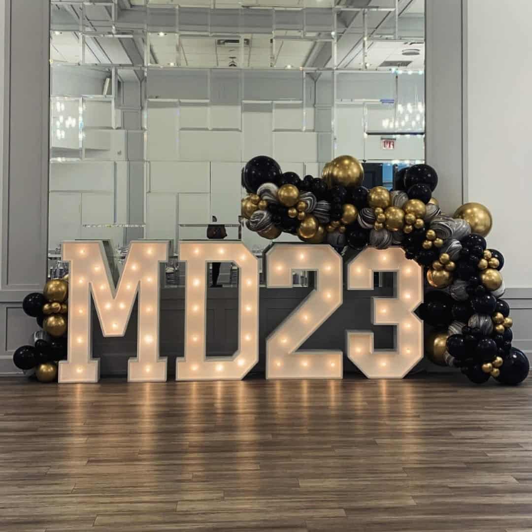 Use large light-up letters spelling “GRAD” or the graduation year as a focal point. Place on the main stage, entrance, or near the cake. Complement with balloons, flowers, or garlands to enhance the look. LED letters add a modern and glamorous touch, suitable for both day and evening parties. These lights create a photo-friendly area and draw attention to key spaces. They’re visually striking, easy to coordinate with colors, and can be reused for future celebrations. This statement piece adds a professional, polished look to any graduation party setup.