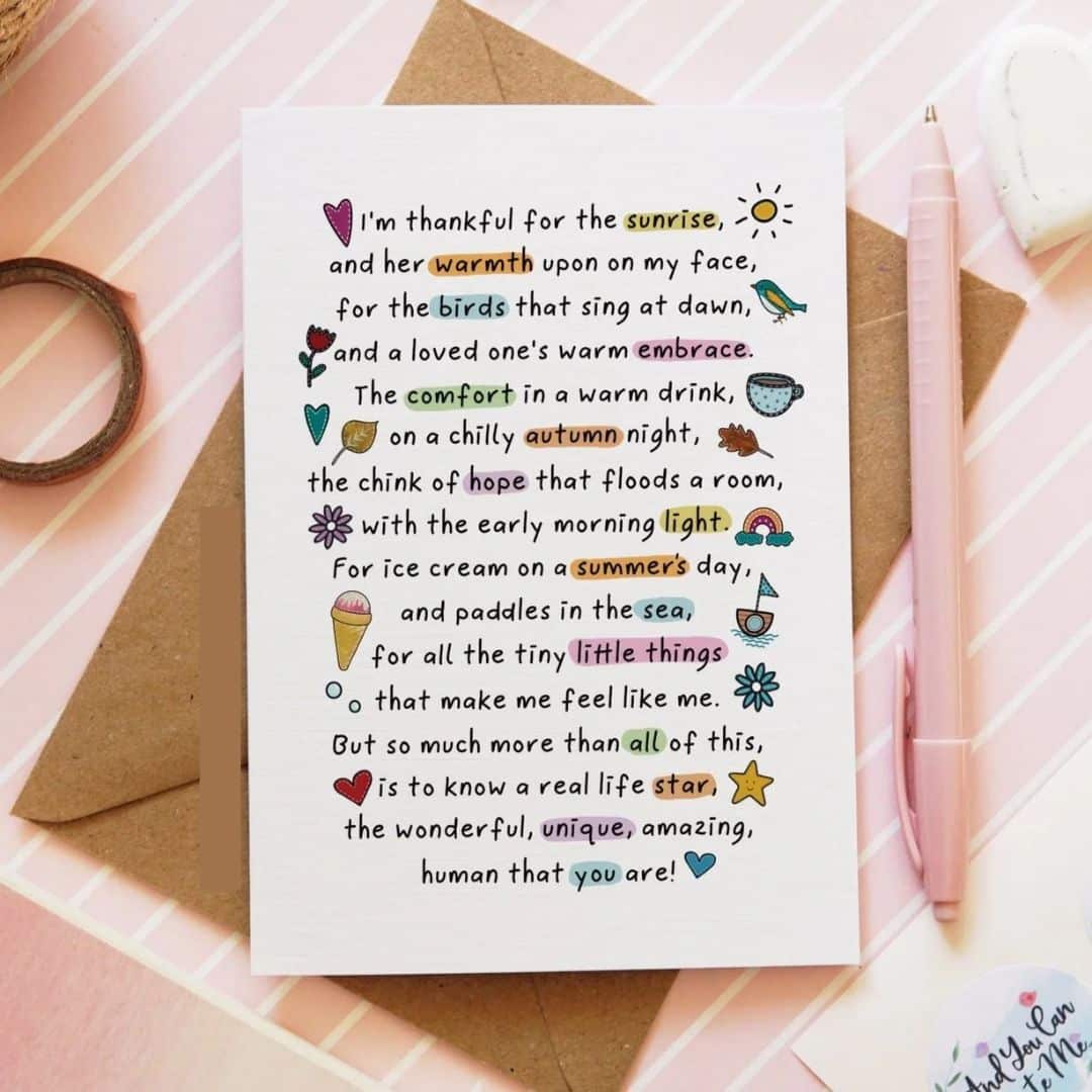 Write a short, heartfelt poem expressing why you’re grateful, and make it the centerpiece of the card’s design. You could decorate with floral borders, soft gradients, or thematic illustrations that match the tone of your poem. The poem could be serious, funny, or whimsical depending on the recipient’s personality. Handwriting the poem makes it feel more personal, but printed calligraphy works too. This type of card shows effort, artistry, and vulnerability—perfect for someone who values heartfelt expression and creativity.