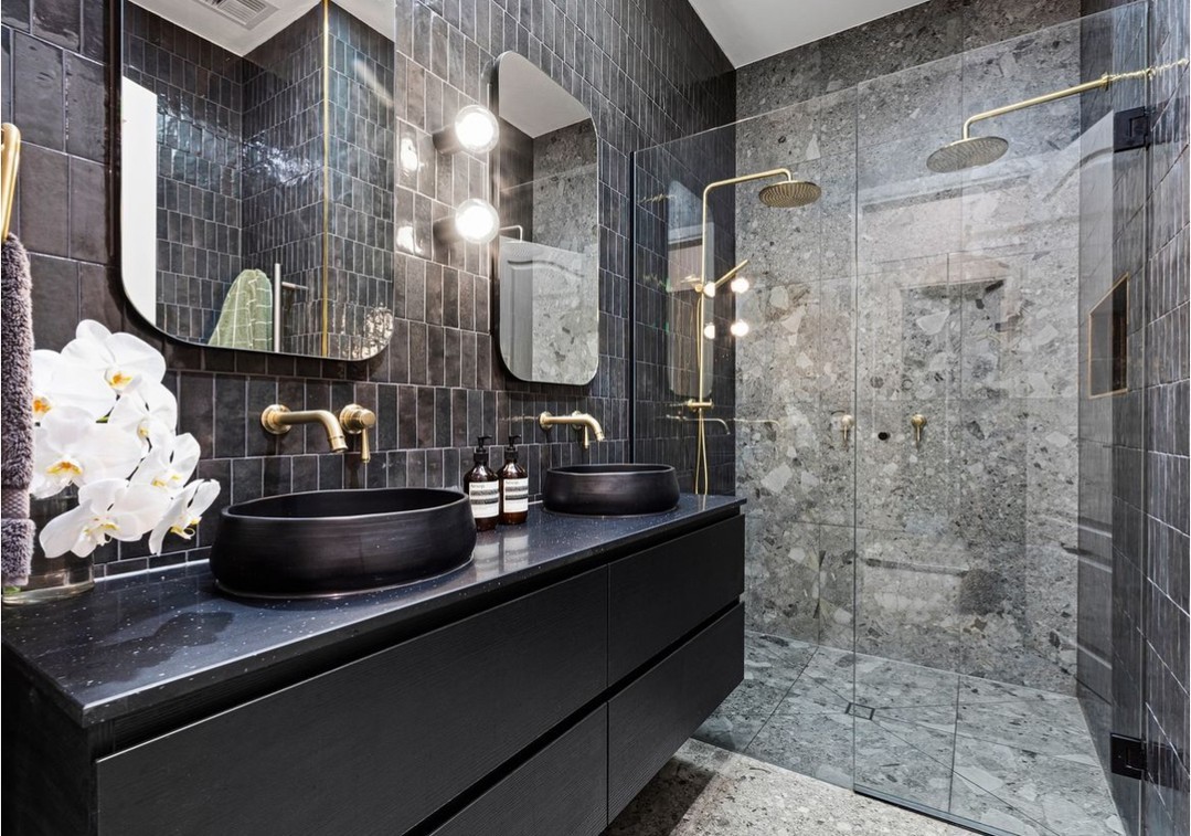 A dark gray bathroom creates a dramatic and intimate atmosphere. Charcoal walls or slate tiles provide depth and richness, especially when paired with soft ambient lighting. Matte black fixtures enhance the moody aesthetic, while lighter accents like white sinks or mirrors prevent the space from feeling overwhelming. Texture is key—ribbed tiles, stone finishes, or patterned floors add visual interest. This design is perfect for creating a luxurious retreat, transforming the bathroom into a bold, stylish space that feels both modern and indulgent.