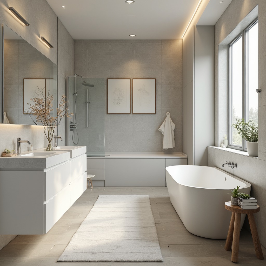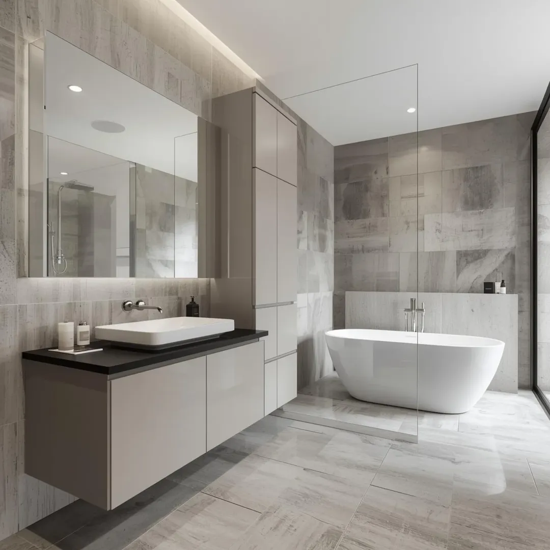 A modern minimalist gray bathroom emphasizes clean lines, simplicity, and calm elegance. Soft light-gray walls paired with sleek matte-gray tiles create a seamless and uncluttered look. Floating vanities in charcoal or concrete finishes enhance the contemporary feel while keeping the space visually open. Chrome or brushed nickel fixtures add subtle shine without overpowering the design. Minimal décor, such as a single framed mirror or a small indoor plant, maintains a serene atmosphere. This style works especially well in smaller bathrooms, where gray tones help reflect light while preserving a sophisticated, timeless appearance.