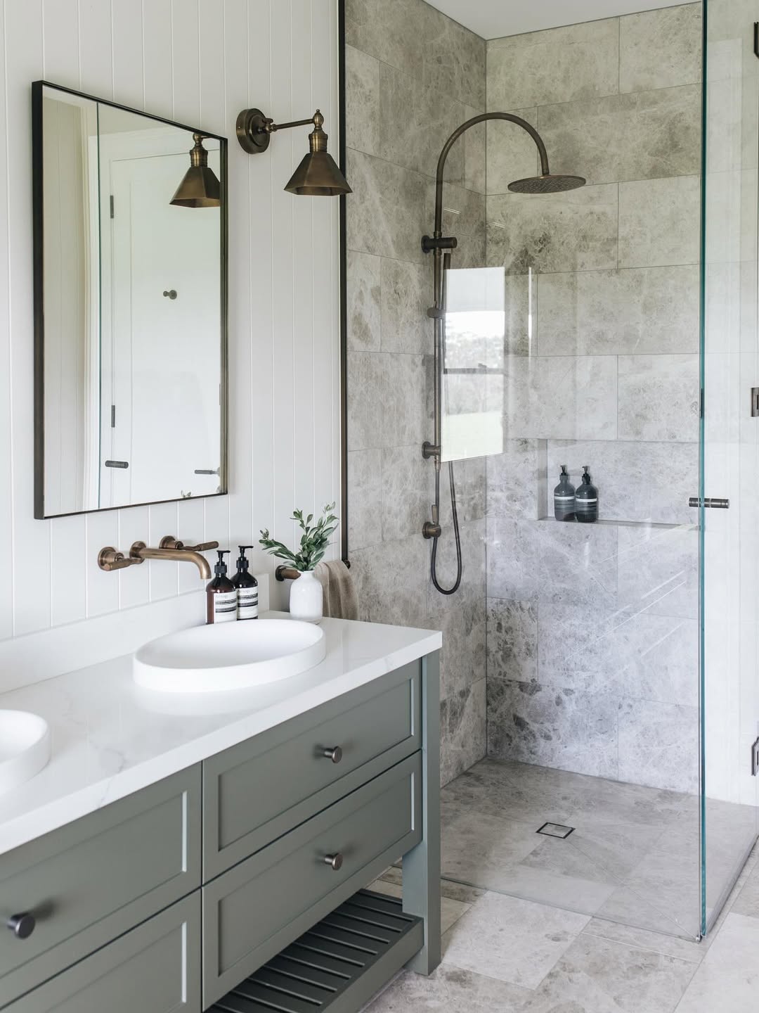 A gray bathroom paired with warm accents feels both stylish and inviting. Gray walls or tiles provide a neutral base, while warm wood tones, beige textiles, or brass fixtures add contrast and comfort. Soft lighting enhances warmth, preventing the space from feeling cold. Accessories like woven baskets or wooden mirrors further soften the look. This design is perfect for homeowners who appreciate gray’s modern appeal but want a welcoming atmosphere that feels balanced, cozy, and visually harmonious.