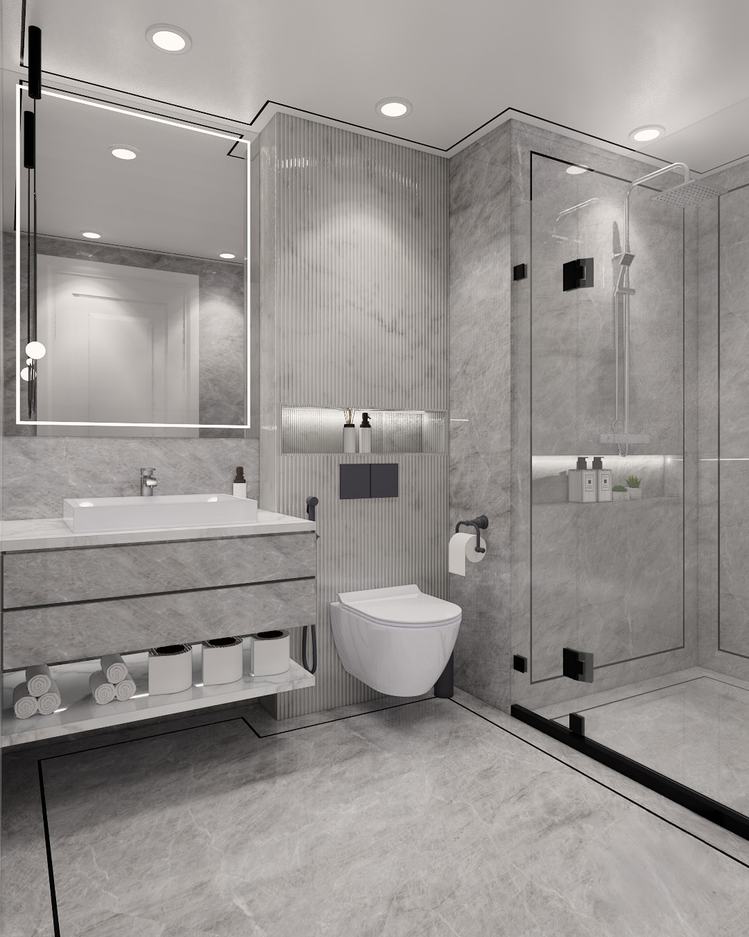 Lighting plays a crucial role in gray bathrooms; warm lighting softens the cool tones, while layered lighting enhances depth and highlights textures. Gray also pairs well with pops of color—soft blues, blush pinks, or greenery can add personality without overwhelming the space. Whether styled in a minimalist, industrial, or classic design, gray bathrooms are practical, stylish, and enduring. Their adaptability ensures they remain fashionable over time while providing a relaxing environment ideal for daily routines and unwinding moments.