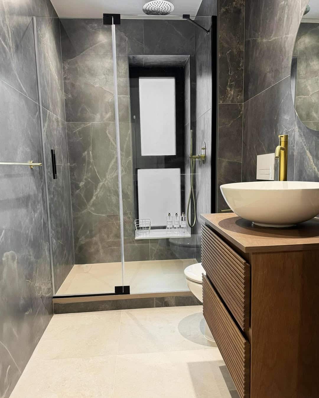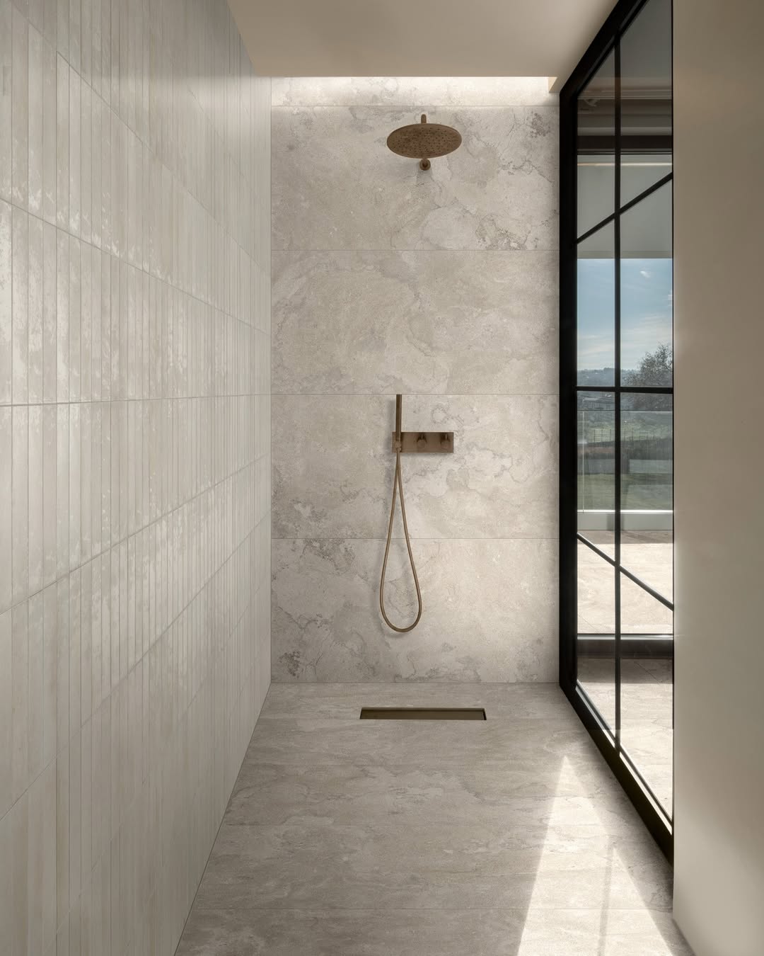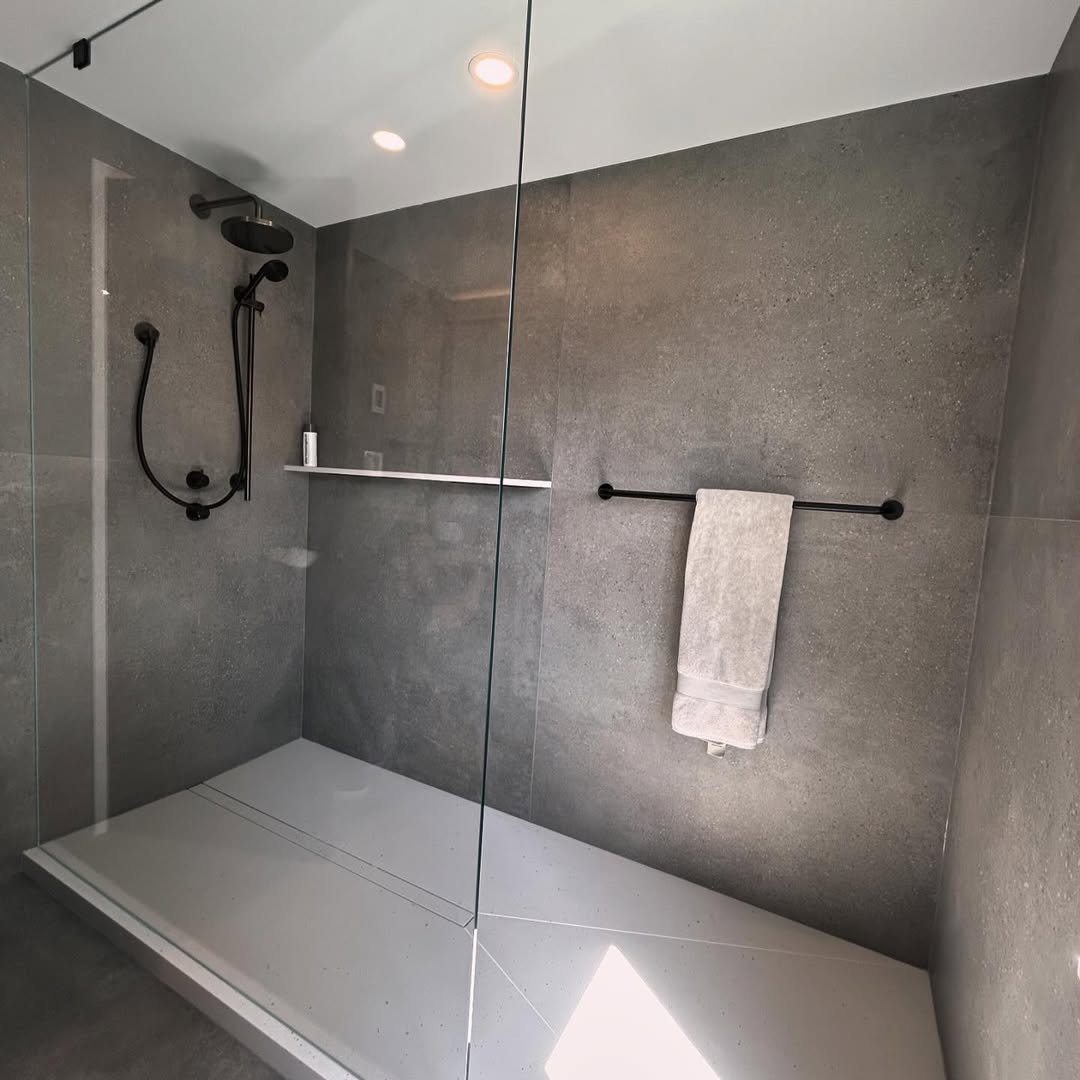 Large-format grey slate tiles create a dramatic, seamless look in showers. Their natural stone appearance adds rugged beauty, while the oversized dimensions reduce grout lines for a sleek finish. Slate’s natural texture makes it slip-resistant and visually striking, with rich variations in grey tones. Darker slate brings moody elegance, while lighter slate feels airy and spa-like. Pairing with frameless glass enclosures and recessed lighting enhances the tile’s natural texture. These tiles work beautifully for walk-in showers, creating a cohesive floor-to-ceiling effect. Grey slate tiles are ideal for homeowners seeking a luxurious, organic shower design with timeless, natural appeal.