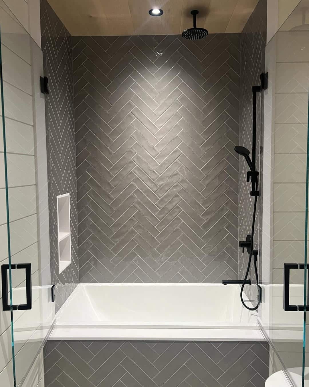 Herringbone patterns using slim grey tiles add elegance and movement to shower walls. The zigzag design creates visual depth and makes the shower appear taller or wider depending on orientation. Light grey tones keep the space airy, while dark greys create a sophisticated, dramatic effect. Glossy finishes reflect light, while matte finishes feel soft and understated. Pairing herringbone grey tiles with contrasting grout enhances the pattern, making it a focal point. They work especially well on a feature wall or inside a shower niche. This design brings both classic charm and modern sophistication, making your shower stand out beautifully.