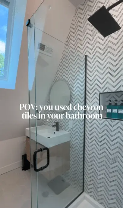 Chevron-patterned tiles in grey and white add dynamic movement and a striking visual effect in showers. The angled design creates a sense of flow, drawing the eye upward or across the wall. This pattern works well for feature walls, niches, or even full shower surrounds. Light grey chevrons feel fresh and contemporary, while darker tones add drama. Pairing with minimalist fixtures ensures the tiles remain the focal point. Glossy finishes enhance the bold pattern, while matte versions feel softer and more subtle. Grey chevron tiles transform showers into statement spaces, combining modern geometric style with timeless sophistication seamlessly.