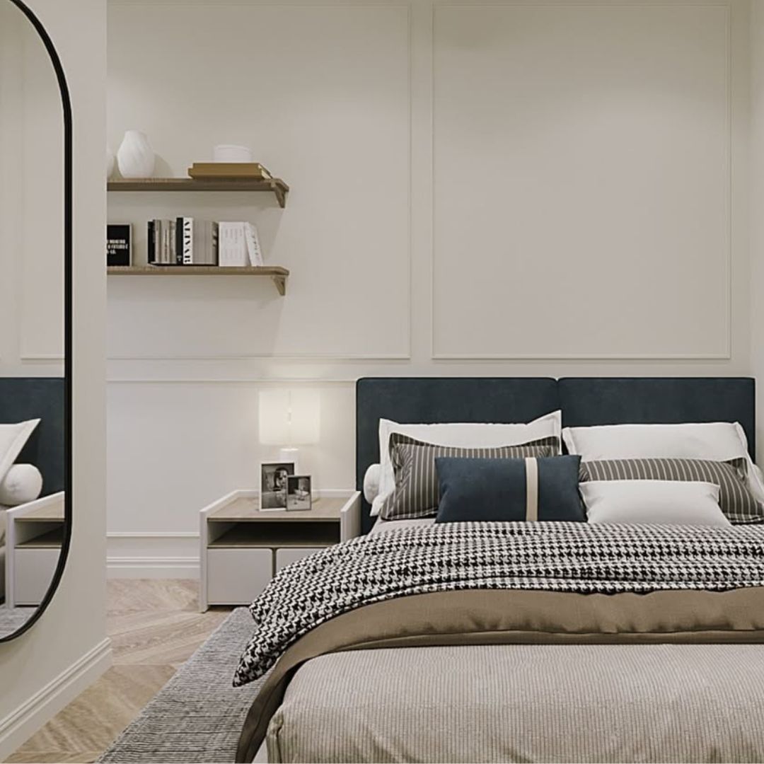 Place matching bedside tables on both sides of the bed to create symmetry and balance.