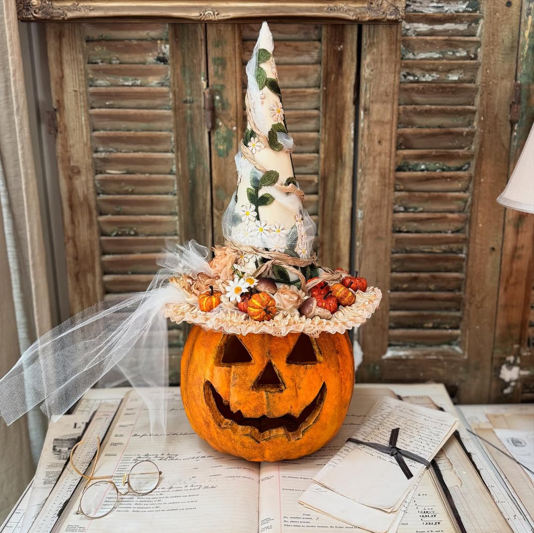 Give your pumpkin a stylish Halloween upgrade by topping it with a witch’s hat. Start by painting the pumpkin black or purple, then add glitter, stars, or a crescent moon design. Attach a store-bought witch hat on top, or craft one from black cardstock. For an extra spooky touch, glue plastic spiders or fake cobwebs around the hat brim. This pumpkin works beautifully indoors as a centerpiece or outdoors on a porch. It’s a simple way to turn an ordinary pumpkin into a charming character, and it pairs nicely with other witch-themed decorations like broomsticks and cauldrons.