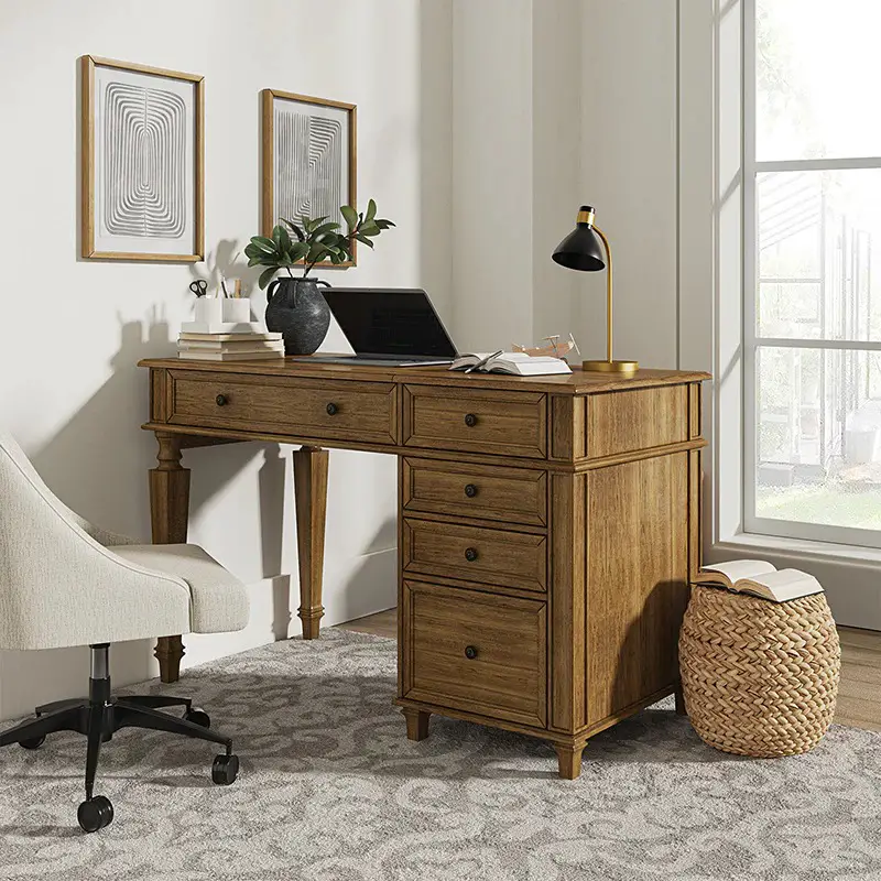 A farmhouse-inspired desk adds warmth and charm to a home office. Typically crafted from distressed wood, these desks feature natural textures and earthy tones. They often include large drawers and sturdy legs, making them both functional and durable. Pairing the desk with vintage accessories, woven baskets, and a cozy chair creates a welcoming, homely vibe. This style is ideal for those who want a comfortable, less corporate work environment. A rustic desk not only serves as a functional workspace but also doubles as a statement piece that enhances the character of your home.