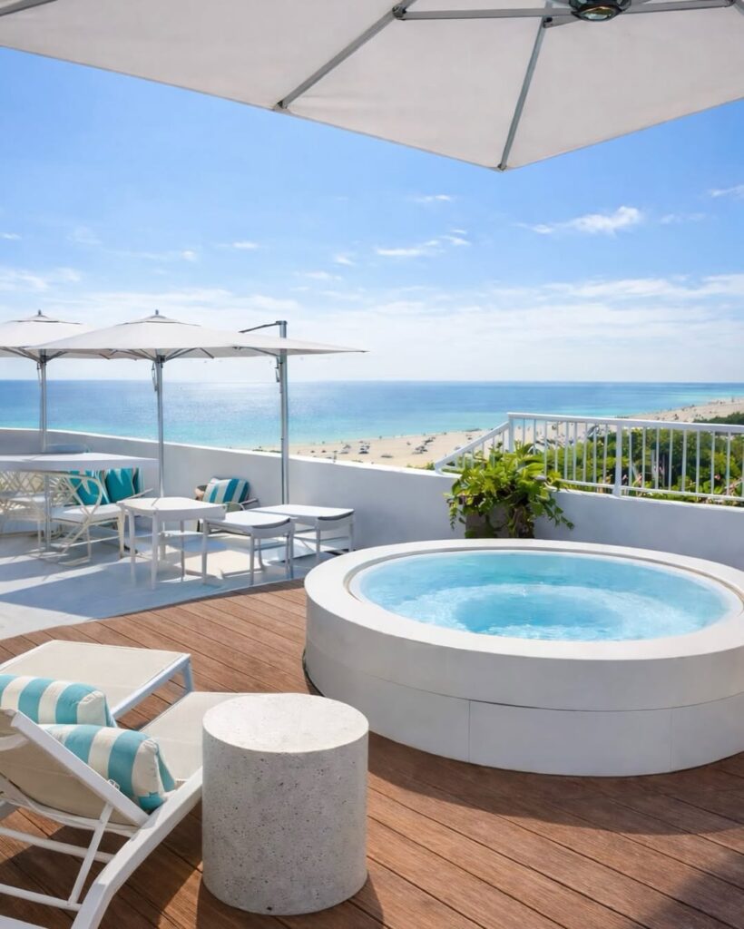 A rooftop Jacuzzi with a city or landscape view feels incredibly luxurious. Position the tub to face the best scenery and use glass balustrades to avoid blocking the view. Install subtle floor lighting for nighttime ambiance. Weather-resistant lounge chairs nearby create a full relaxation zone. A retractable awning offers shade when needed. This idea maximizes vertical living spaces and turns unused rooftops into premium leisure areas. The combination of warm water and open sky makes it a standout feature for entertaining guests or enjoying solo sunset soaks.