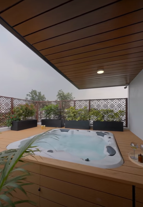 Incorporate Japanese-inspired design by placing the Jacuzzi within a Zen-style terrace. Use gravel beds, stepping stones, bonsai trees, and minimalist greenery. A bamboo screen or small fountain enhances tranquility. Stick to a neutral palette of stone, sand, and soft greens. The goal is harmony and calm. This design promotes mindfulness and relaxation, making every soak feel meditative. It’s ideal for those who want their terrace to be a peaceful sanctuary away from noise and visual clutter.