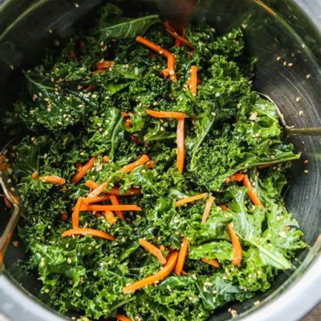This salad has an Asian flair with sesame oil, soy sauce, and ginger, paired with crunchy vegetables and tender kale for a flavorful bite.