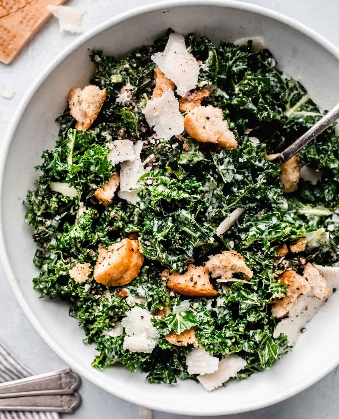 A healthy twist on the traditional Caesar salad using kale instead of romaine. The robust flavor and texture of kale pairs beautifully with a creamy homemade Caesar dressing and crunchy croutons.