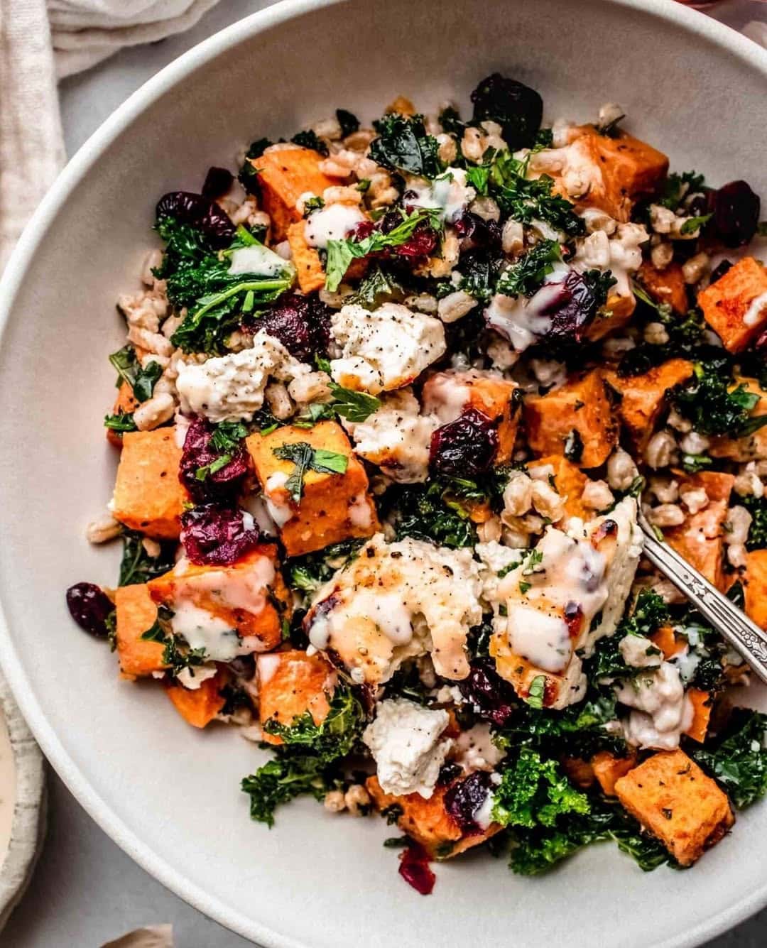 This hearty salad blends the sweetness of roasted sweet potatoes with tangy goat cheese and earthy kale, creating a perfect fall dish.