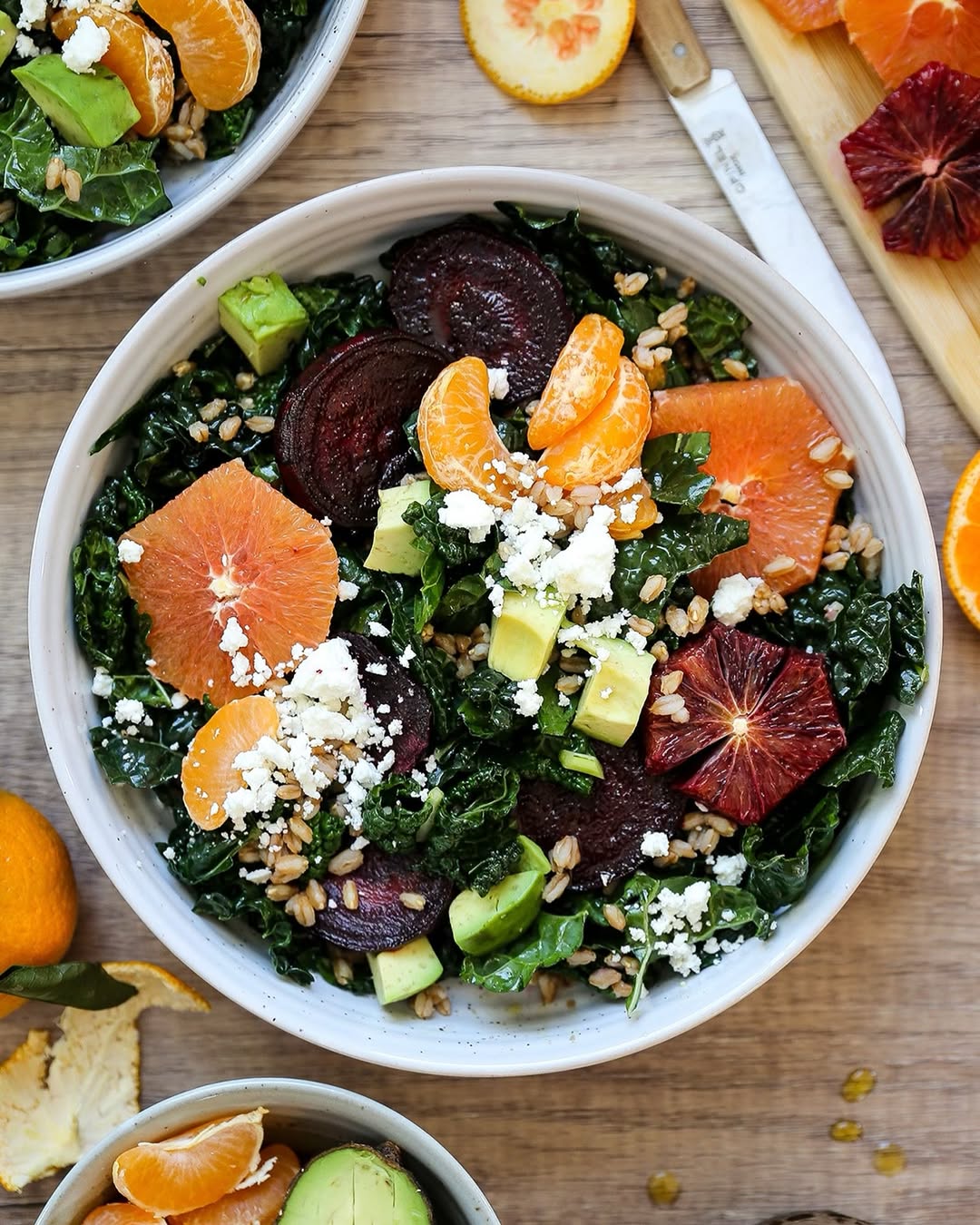 A colorful, vibrant salad combining earthy beets, bright citrus, and hearty kale, topped with crumbled feta and toasted almonds for extra texture.