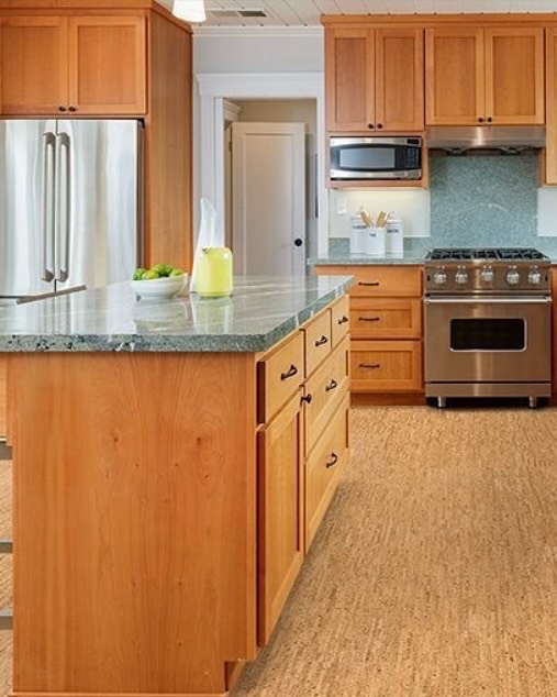Cork flooring is an eco-friendly and comfortable option for kitchens. Made from renewable cork bark, it provides a soft, cushioned surface that reduces foot fatigue during long cooking periods. Cork is naturally resistant to mold and mildew and offers excellent sound insulation. When sealed properly, it can handle kitchen moisture and spills. Its warm tones and subtle texture create a cozy and inviting kitchen atmosphere. Although it requires occasional resealing, cork flooring is sustainable, unique, and ideal for homeowners prioritizing comfort and environmental responsibility.