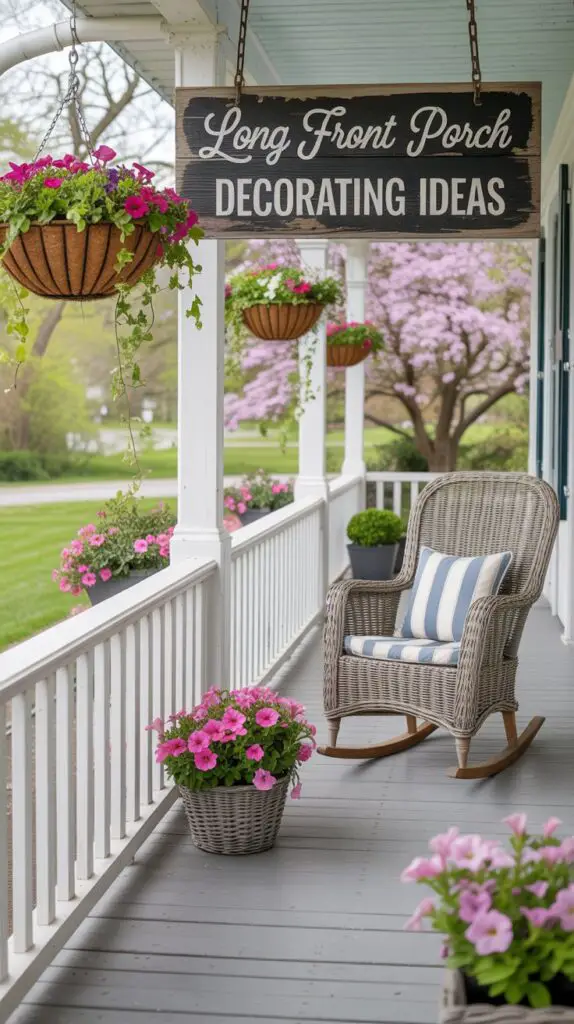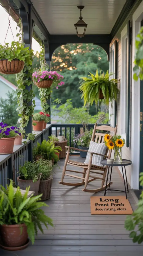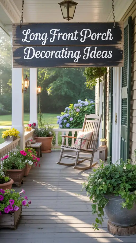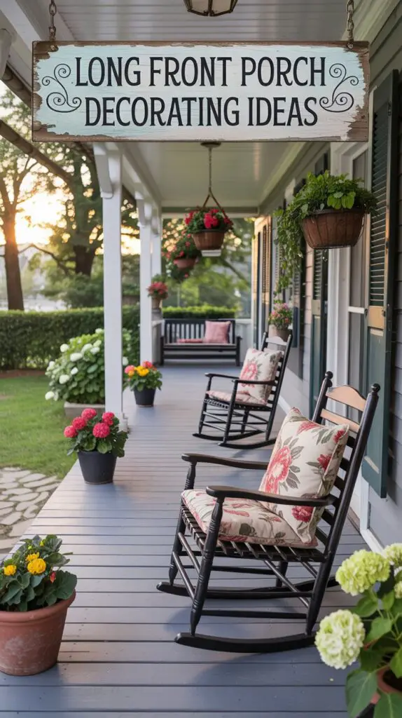 Here’s a 100+ list of Long Front Porch Decorating Ideas to help you create a welcoming, stylish, and cozy outdoor space: