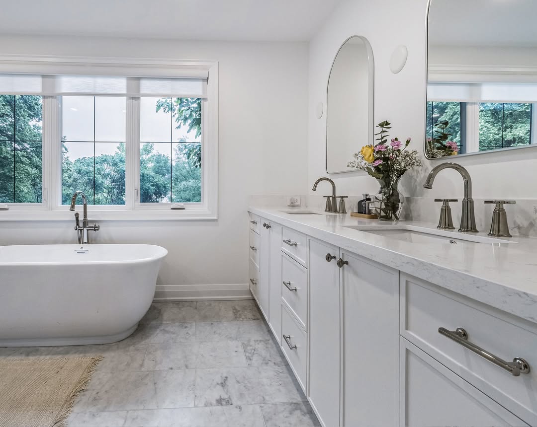 A classic white bathroom never goes out of style and creates a bright, clean, and timeless look. It also allows decorative accents to stand out beautifully.