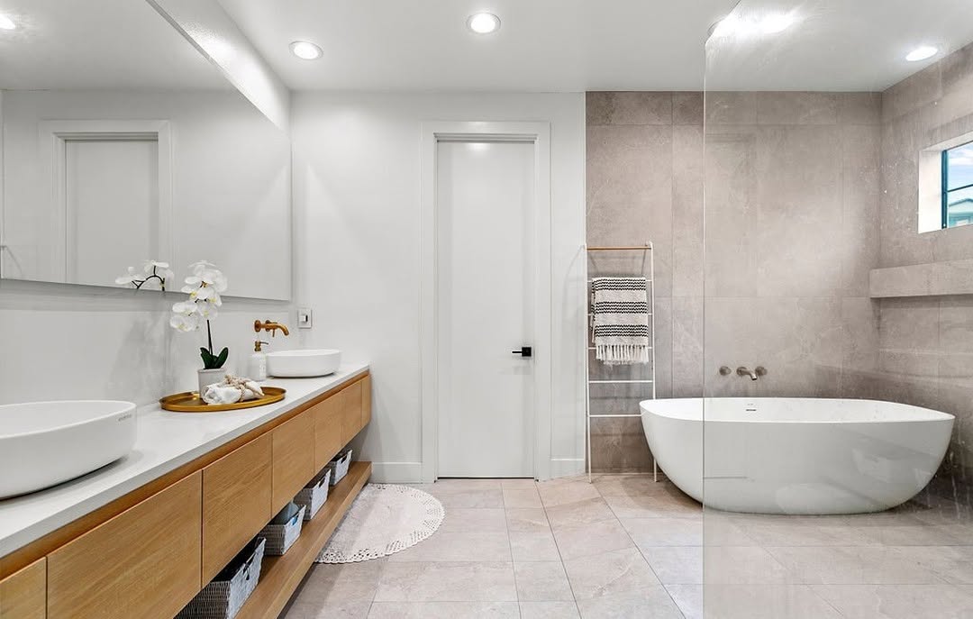 Add wooden elements like a teak bath mat, bamboo shelves, or a floating wooden vanity to bring warmth and balance.
