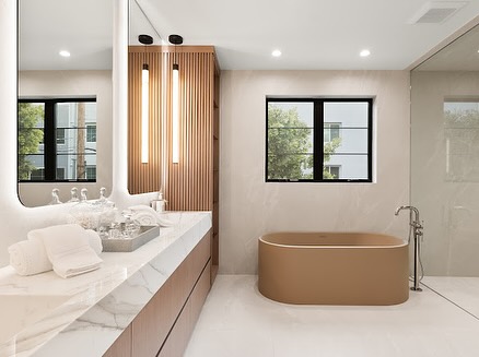A spa-inspired master bathroom focuses on calm colors, natural materials, and uncluttered elegance to create a soothing escape. Soft textures and warm lighting help transform everyday routines into moments of relaxation.